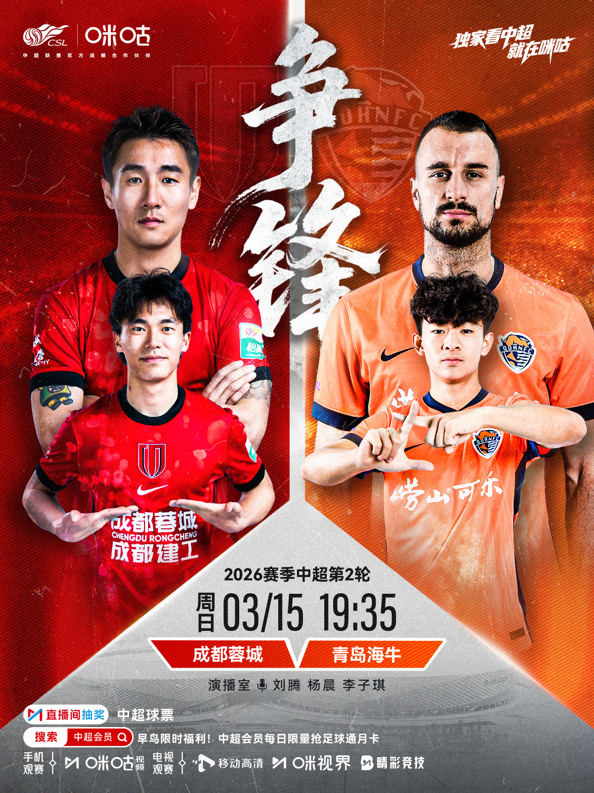 𝑪𝑺𝑳 《争锋》⚽️ 2026中超联赛第二轮🏟️ 成都蓉城 对阵 青岛海牛⏰ 3/15周日 19:35☝️ 邝兆镭17岁的第一场比赛👀 #独家看中超就在咪咕# 网页链接