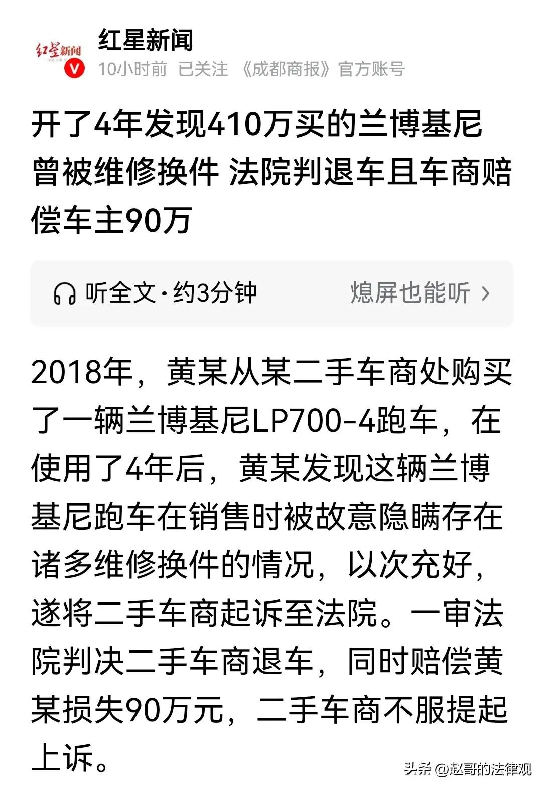 兰博基尼下的“暗战”:高手过招,诚信为王 今儿咱们说说一桩发生在京城的“豪车罗生门”。这事儿,没有刀光剑影,却有“暗流涌动”;没有快意恩仇,却有“天价赔偿”。一位黄姓男子,豪掷410万,从某二手车商手中购得一辆兰博基尼LP700-4。本以为是“圆梦超跑”,谁料,四年后的一次偶然,竟揭开了这辆“大牛”背后见不得光的“伤疤”。 话说这黄某,开着这辆拉风的跑车,风驰电掣了四年,心里那叫一个美。可俗话说得好,“纸包不住火”,他在一次细致的检查中赫然发现,这辆所谓的“精品车”,在出售时竟被隐瞒了诸多“维修换件”的事实。好家伙,这哪里是买跑车?分明是买了个“精心整容”的“事故大王”。这二手车商也是“道行高深”,自以为“瞒天过海”,殊不知在法律的“照妖镜”下,一切“障眼法”都是徒劳。黄某一怒之下,将车商告上法庭,这便是“高手过招”,一出手便知有没有。 一审法院经审理,认定车商虽无法确认是“刻意隐瞒”,但其未尽到详尽检测义务,存在“重大违约”,判决退车并赔偿90万。车商不服,提起上诉,估计是觉得“冤枉”或者“亏了”。然而,二审法院——北京市第二中级人民法院的判决更是“雷霆万钧”,直接驳回上诉,维持原判!这记“重锤”砸得干脆利落,给那些还在玩“文字游戏”、打“擦边球”的不良商家敲响了警钟。这世上,唯有“法律”和“良知”不可辜负。 但这“官司”的背后,藏着的正是咱们今天要说的“大健康”意识。真正的健康,讲究“内外双调”。外在,咱们消费者得练就一双“火眼金睛”,买车如“选妃”,得查“祖上三代”的维修记录,别被那光鲜的外表迷了心窍;内在,这“感恩之心”更是“护身符”。我们要感恩这“公正”的判决,是它维护了市场的“绿水青山”;更要感恩这“法治”的力量,它让“欺诈”无处遁形。做生意讲诚信,买车子懂鉴别,这才是市场健康的“不二法门”。 我们要感恩这“迟到”的真相,它虽让人恼火,却也让我们对“诚信”二字有了更深的敬畏。 愿世间少一些“尔虞我诈”的算计,多一些“童叟无欺”的真诚。 愿你我皆安康,前程皆似锦!