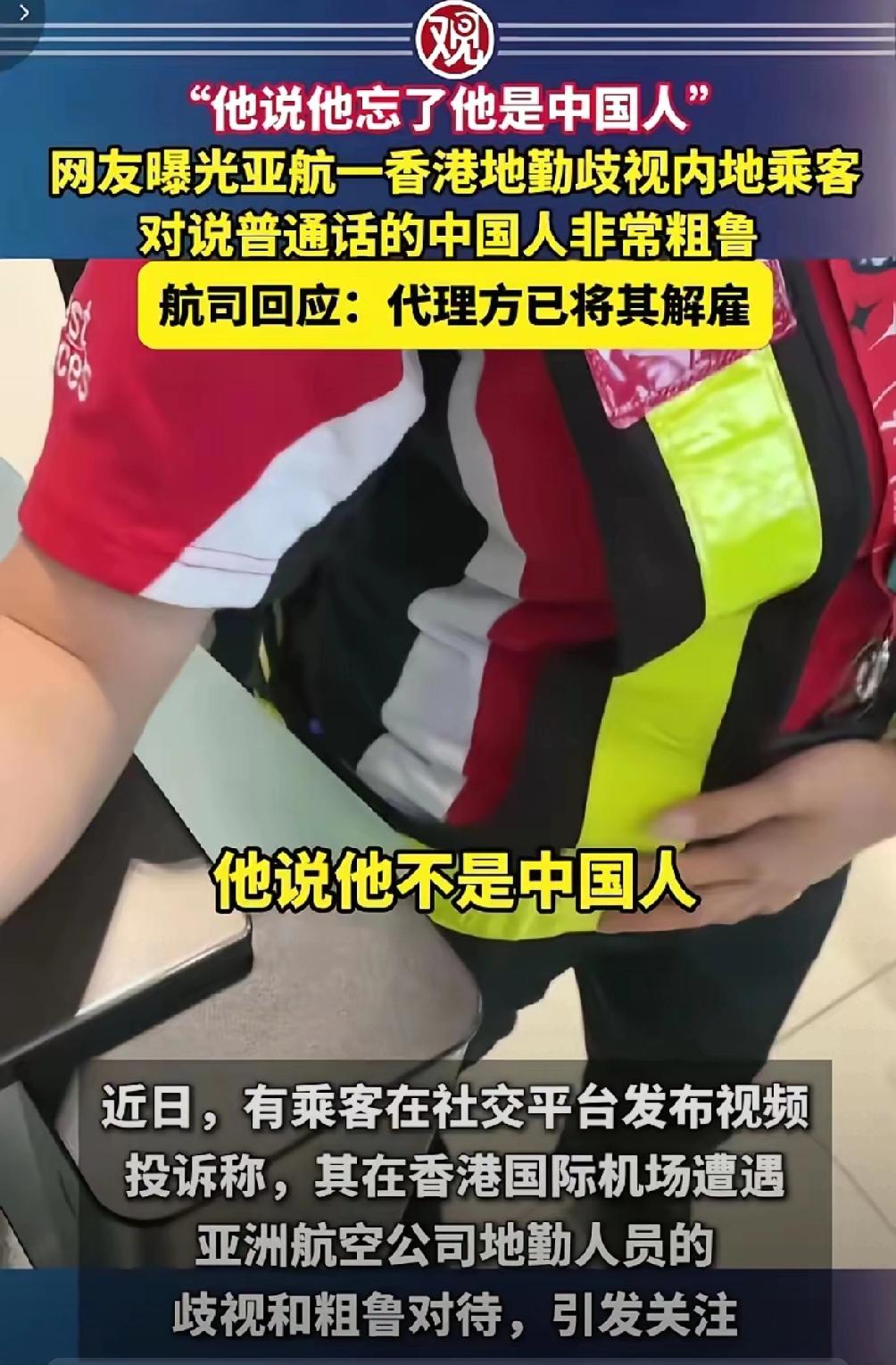 结局大快人心!讲普通话、香港户籍的地勤叫嚣不是中国人,已被直接解雇! 有的人天生奴性,跪久了永远都站不起! 涉事人员是香港机场地服代理公司的外包员工,事发时负责亚洲航空航班的地面服务。他面对说普通话的内地旅客态度粗鲁恶劣,还在公开场合明确否认自己的中国公民身份。旅客将现场沟通情况发布到网络平台,相关内容迅速引发全网关注,无数网友留言谴责这种割裂身份、伤害民族情感的言行。 地服代理公司在核实全部事实后,没有任何推诿拖延,直接对涉事地勤作出解雇决定。其直属主管因现场监管不到位、未能及时纠正不当言行,同步被公司降职处理。亚洲航空中国区总经理主动向受影响旅客公开致歉,承诺全面加强对合作代理方的人员培训与服务监管,杜绝同类事件再次出现。 香港在1997年回归祖国怀抱,是中华人民共和国不可分割的特别行政区。香港居民的中国公民身份,由国家宪法与香港特别行政区基本法共同明确,不存在任何变通与否认的空间。这名地勤在香港出生成长,日常熟练使用普通话沟通,却刻意无视历史与法律事实,主动割裂与祖国的血脉联系。 香港特别行政区维护国家安全法清晰划定分裂国家行为的法律红线。煽动分裂国家、破坏国家统一的言行,都会受到法律的约束与相应处理。涉事企业依据内部规章制度解雇相关人员,是坚守国家底线、维护社会公序良俗的正当做法,也完全契合全体中华儿女的共同心声。 忘记自身根脉、否定公民身份,从来都无法被社会与同胞接纳。香港长期的繁荣稳定,始终依托于祖国大陆的坚实支撑。每一位香港居民都应当认清与生俱来的中国公民身份,自觉坚守民族立场,主动维护国家主权、统一与领土完整。 挑战国家底线、轻视同胞情感的行为,必然要承担对应的后果。这次解雇处理不是过度处置,是对国家尊严的坚定守护,是对民族情感的基本尊重。 各位读者你们怎么看?欢迎在评论区讨论。