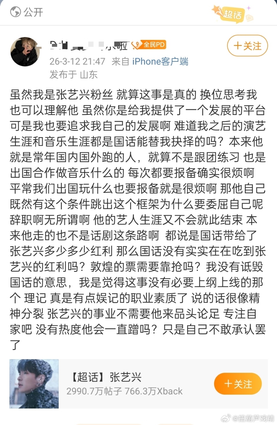 张艺兴 国话红利事件现在众说纷纭,又牵扯出妈妈经纪人、曾被国家话剧院召回、限韩令等,具体真瓜真相咱也不清楚,粉丝这个时候就不要添乱了,他什么时候能公开露面?