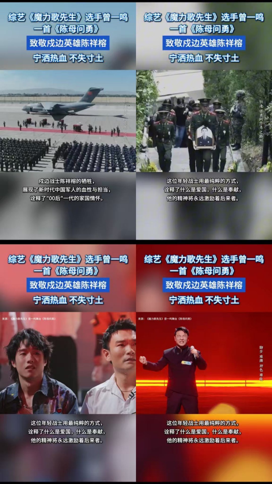 曾一鸣陈母问勇唱出了家国情怀在音乐节目魔力歌先生 的舞台上,歌手曾一鸣带来了歌曲《陈母问勇》的演唱,这首作品以戍边英雄陈祥榕烈士的真实事迹为创作原型,将英雄故事与音乐表达相结合,节目中,曾一鸣通过音乐叙事的方式,讲述英雄母亲“问儿勇否”的故事,展现新时代军人的家国担当与忠诚坚守,传递致敬英烈、铭记英雄的主题。作品通过艺术化的方式致敬英烈与英雄母亲,让英雄精神以音乐的形式被更多观众了解。