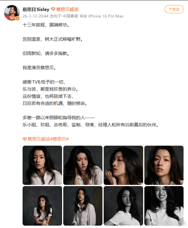 蔡思贝发文告别TVB 发文告别TVB,“感谢TVB给予的一切,乐与苦,都是我珍贵的养分。这份情谊,也将延续下去,日后若有合适的机遇,随时候命。”
