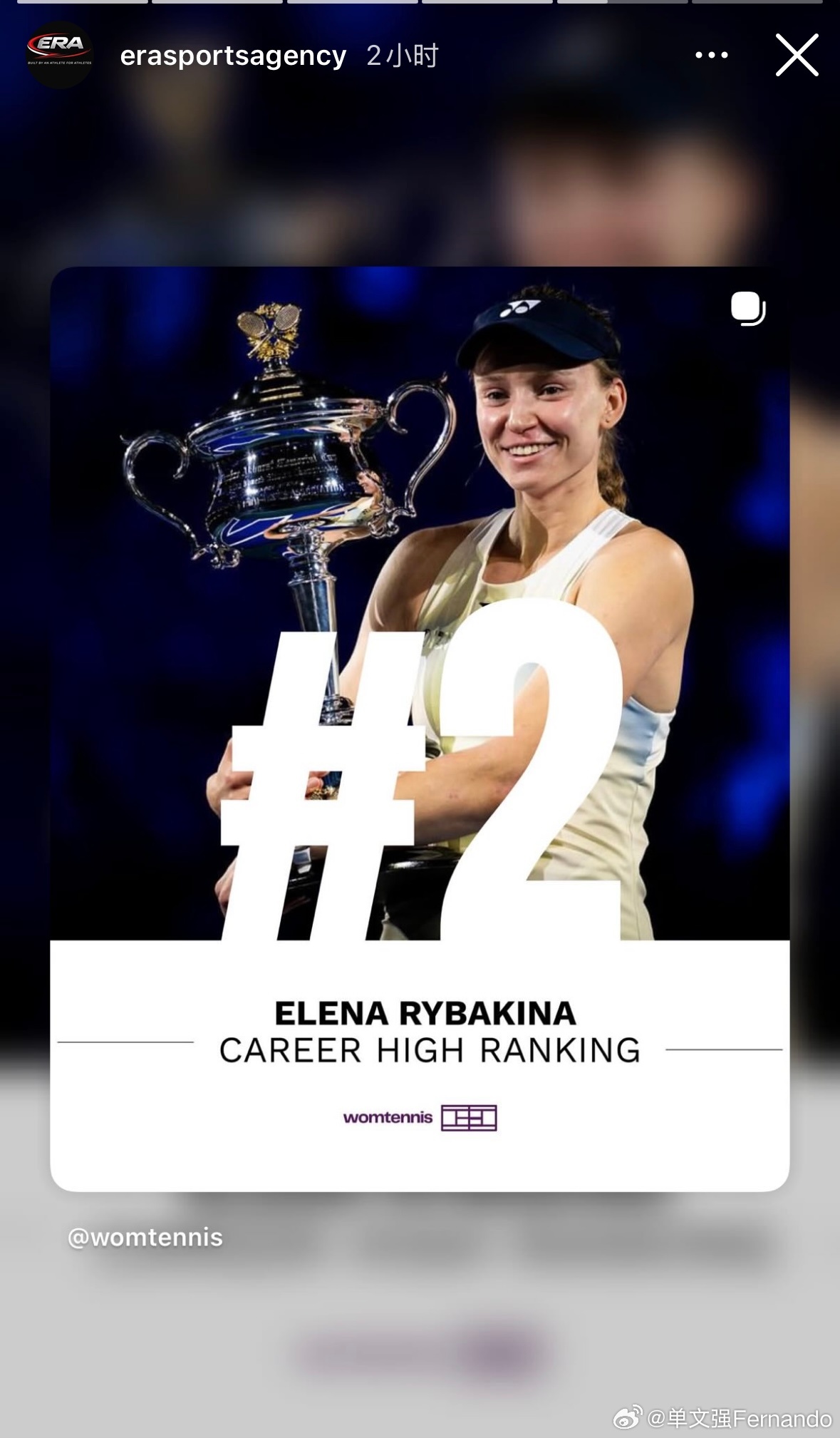 莱巴金娜!荣登世界第二No.2🔝自己的工作室连续发了两条,祝贺老板!其中第二条转发了一下Lena排名的上升趋势,从去年宁波500赛夺冠开始- WTA年终总决赛夺冠-澳网大满贯夺冠-今天IW闯入四强,真的是环环相扣……莱巴金娜首登世界第二wta