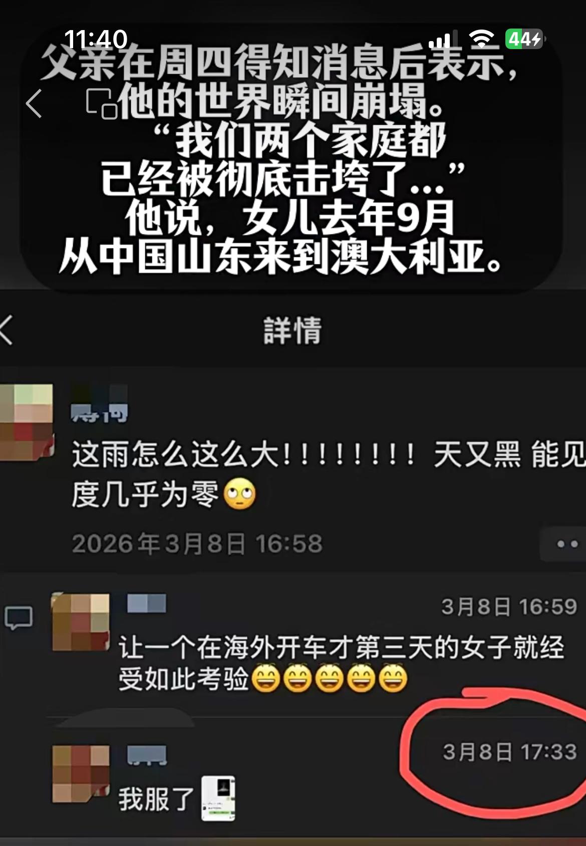 澳大利亚山洪身亡的中国男女,遇害细节曝光。男子 26 岁姓邱来自福建三明,女子姓郭 23 岁来自山东青岛。 两人都是 2025 年年底申请的澳大利亚旅游工作签,年轻人都想去外面看看世界,他们之前都在澳大利亚农场工作。因为现在是澳大利亚的夏季,很多农场的水果成熟,需要大量人手进行采摘。澳大利亚会放开针对全世界的年轻人的这种旅游办工作的签证,小邱和小郭应该是同在一个中国人的旅游工签群。 3 月 7 日晚上小邱开着斯巴鲁接上了小郭,准备一起去往位于澳大利亚昆士兰的Gayndah柑橘园。因为地处偏远,为了在 3 月 8 日赶到,他们不顾狂风暴雨,执意前往。 可能是因为对澳大利亚的风雨天气没有认知,再加上他们刚刚拿到驾照,对路况不熟。行到半路的时候,人就失踪了。几天后才在一处河道找到了他们的车辆,两人已经遇难。女孩朋友圈留言,不幸成了最后的遗言。