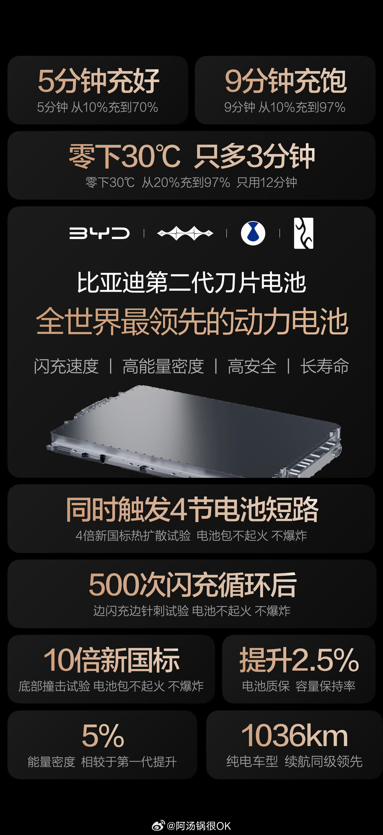 比亚迪重磅发布第二代刀片电池,实现“常温充电,5分钟充好,9分钟充饱;低温充电,零下30度,只多3分钟”,以“闪充、高能量密度、长寿命、高安全”全能表现,重新定义全球领先动力电池,一举攻克“充电慢”“低温充电难”的行业痛点。