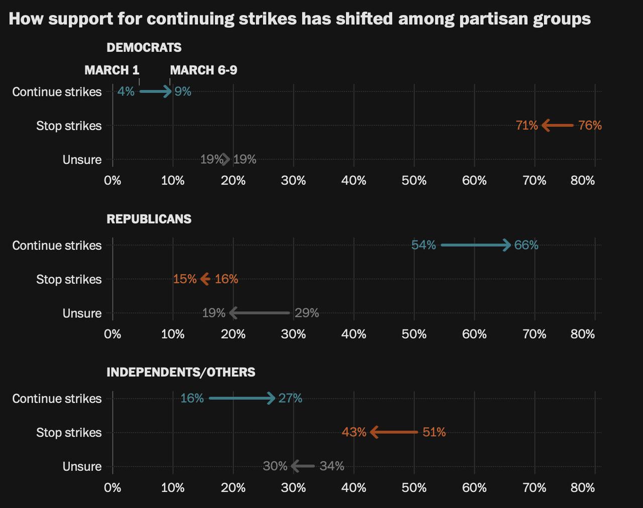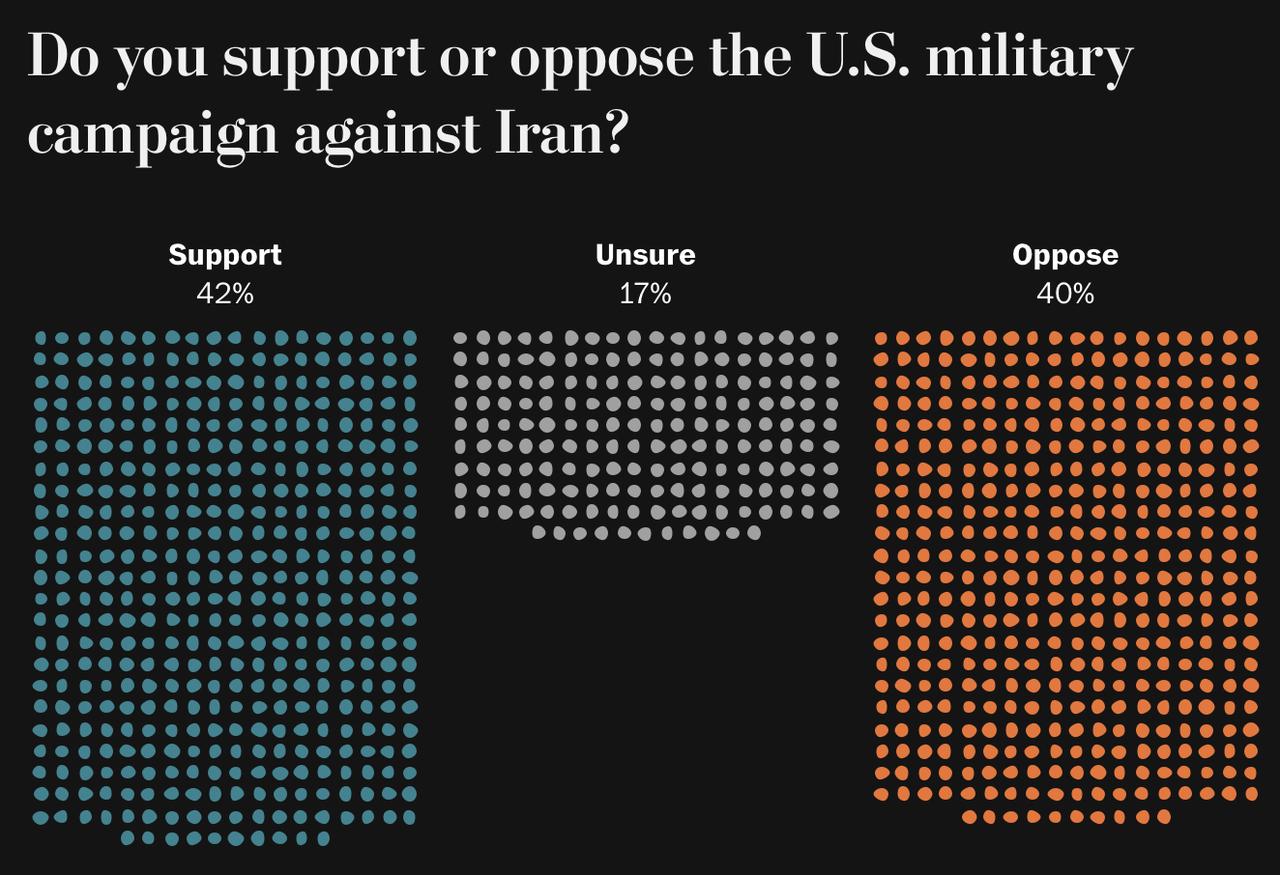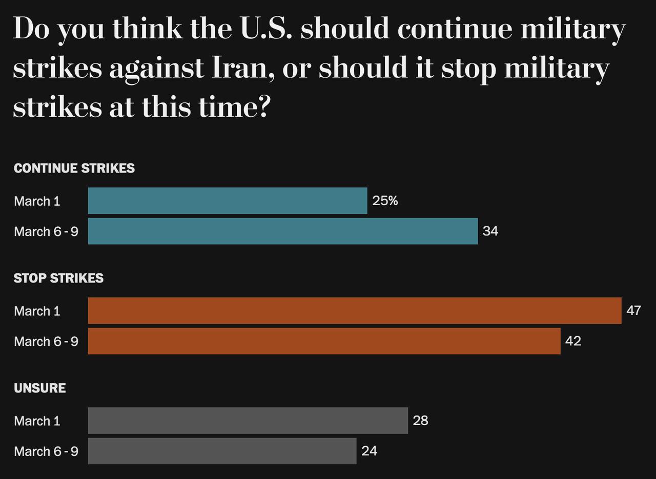 《华盛顿邮报》一项针对1005名美国成年人的最新民调显示,随着美伊冲突持续,美国公众对这场战争的反对有所减弱,但整体态度仍偏谨慎。42%受访者表示支持“美国对伊朗的军事行动”,40%反对,17%尚未确定。相比空袭开始后不久一项针对“特朗普下令空袭伊朗”的调查,支持率从39%小幅升至42%,反对率则从52%降至40%。不过,在是否应继续打击的问题上,仍有更多人主张现在就停止空袭:42%支持停火,34%支持继续打击,24%尚未决定。与开战初期相比,支持继续打击的比例上升了9个百分点,主张停止的比例则下降了5个百分点。 这项调查同时显示,美国人对战争目标和代价仍存明显疑虑。多数受访者认为,特朗普政府并未清楚解释这场战争要达到什么目的;同时,大多数人认为目前已报告的美军伤亡人数,包括7名阵亡军人,是不可接受的。报道说,不少美国人仍在观望,或同时抱有支持与担忧并存的复杂态度,说明在开战不到两周之际,公众意见仍未完全定型。 图片来源于网络