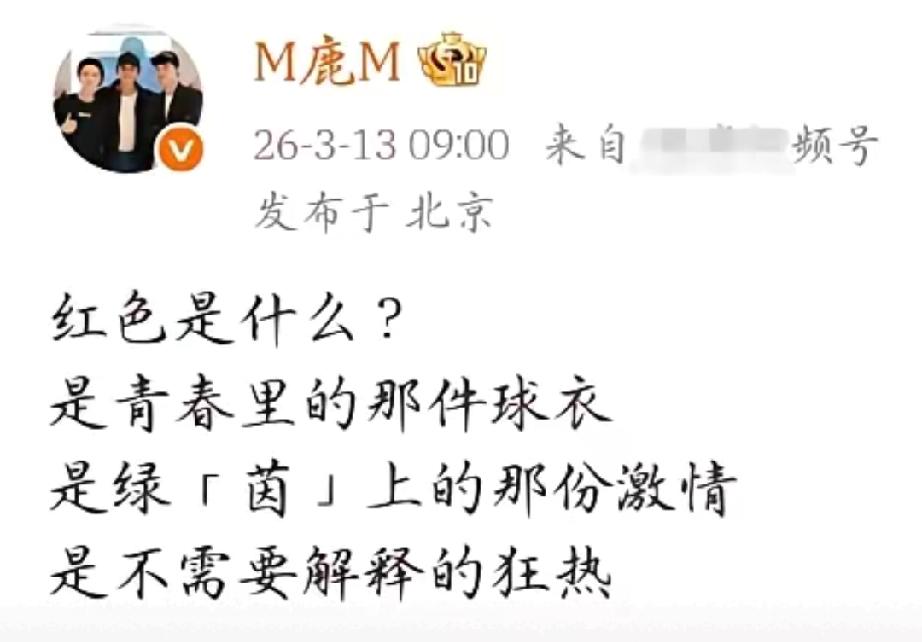 鹿晗凌晨发问:红色是什么?三句答案藏满热爱,官宣新代言太戳心 今早9点,鹿晗社交平台突发灵魂提问:红色是什么?他给出答案——是青春里的那件球衣,是绿茵上的那份激情,是不需要解释的狂热。 原来这是他官宣茵宝代言,以足球热爱诠释“正红当燃”。红色于他是信仰,于你我又是什么?是心动唇色,是落日余晖,还是藏在心底的滚烫热爱?快来评论区留下你的答案! 鹿晗报喜 鹿晗跑男十周年