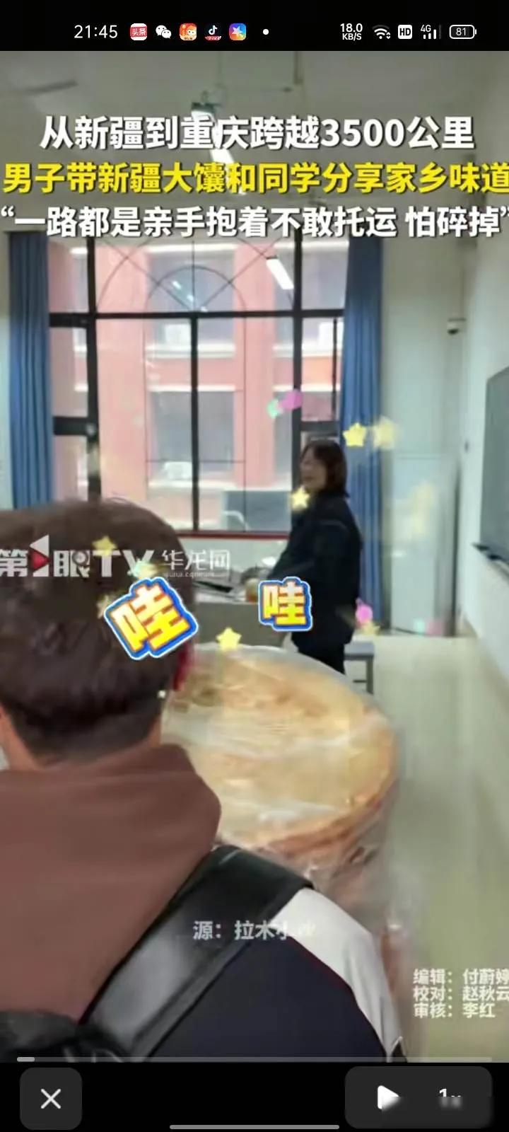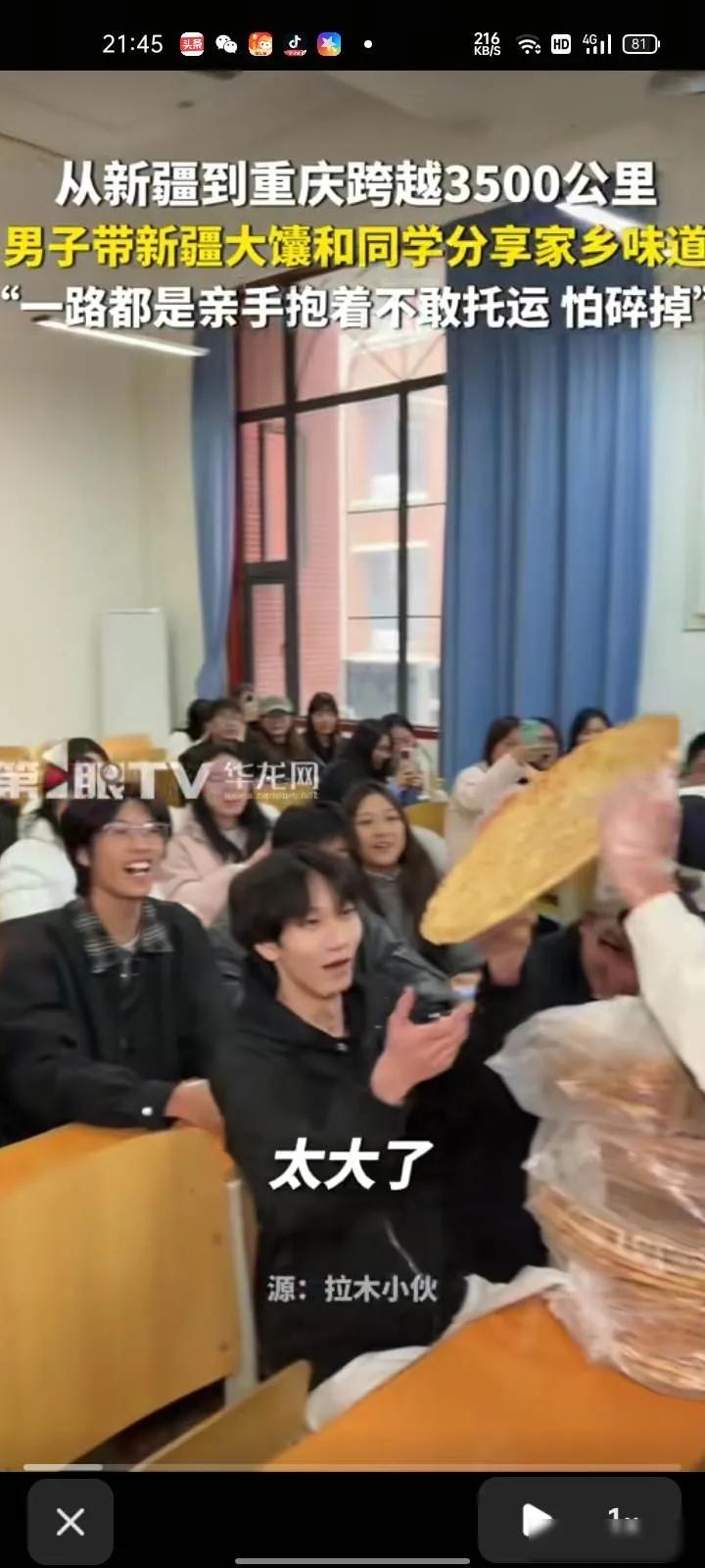 三月九号下午,在重庆一所大学的教室,一位从新疆和田来的维吾尔族学生从包里拿出一块大馕,这馕直径差不多半米,重量有三公斤,是他在家的时候他妈妈亲手做的,他没有选择快递寄送,也没有办托运,因为馕太软,一碰就容易碎掉,也没办法放防腐剂,他就自己把馕背上火车,转乘大巴,一路走了两千多公里,花了将近四十个小时才到学校。新疆本地人想把自己家里做的馕带给外地亲戚,基本上只能靠人亲自带过去,这次学生自己背过来,反而让同学看到“馕”背后那种没有被标准化、带着母亲手艺的东西。 网友评论: 我们上学那会儿,班里的新疆同学每次开学回来都会给我们几个“烟民”带一大包“莫合烟”,足够我们抽多半个学期的,真是太满足了! 四十小时的奔赴,三公斤的母爱,一块馕牵起疆渝情,人间最暖不过这份藏在烟火里的温柔与牵挂 这是给新疆做的最好的宣传[赞][赞][赞] 儿行千里母担忧!这世间唯有母爱是无价[赞] 我家楼下很多做馕的,刚烤出来确实很好吃,又便宜,小的三块钱一个,不过冷了后我就不好吃,咬不动了。 新疆手工馕 来源:苏苏慢走