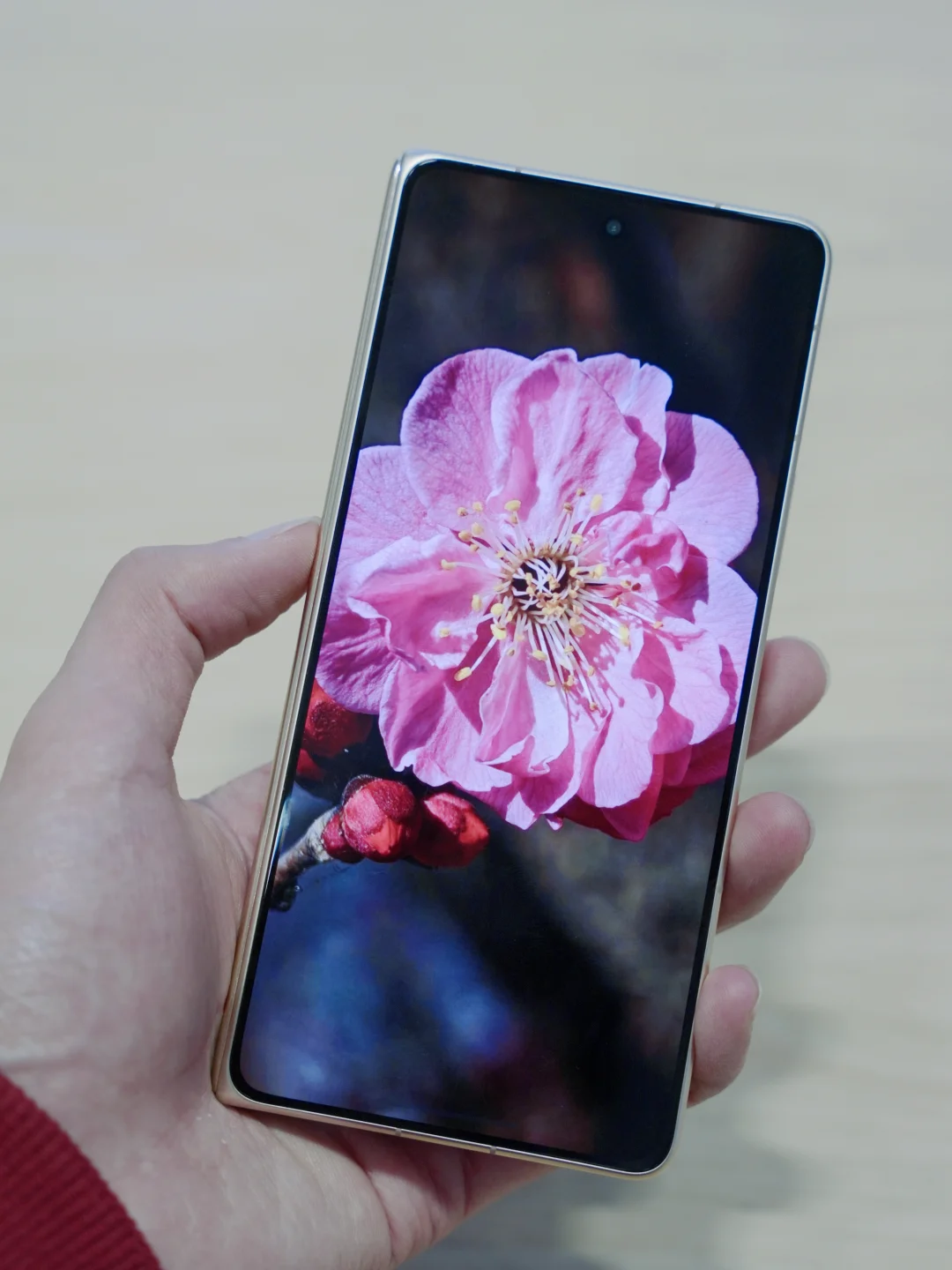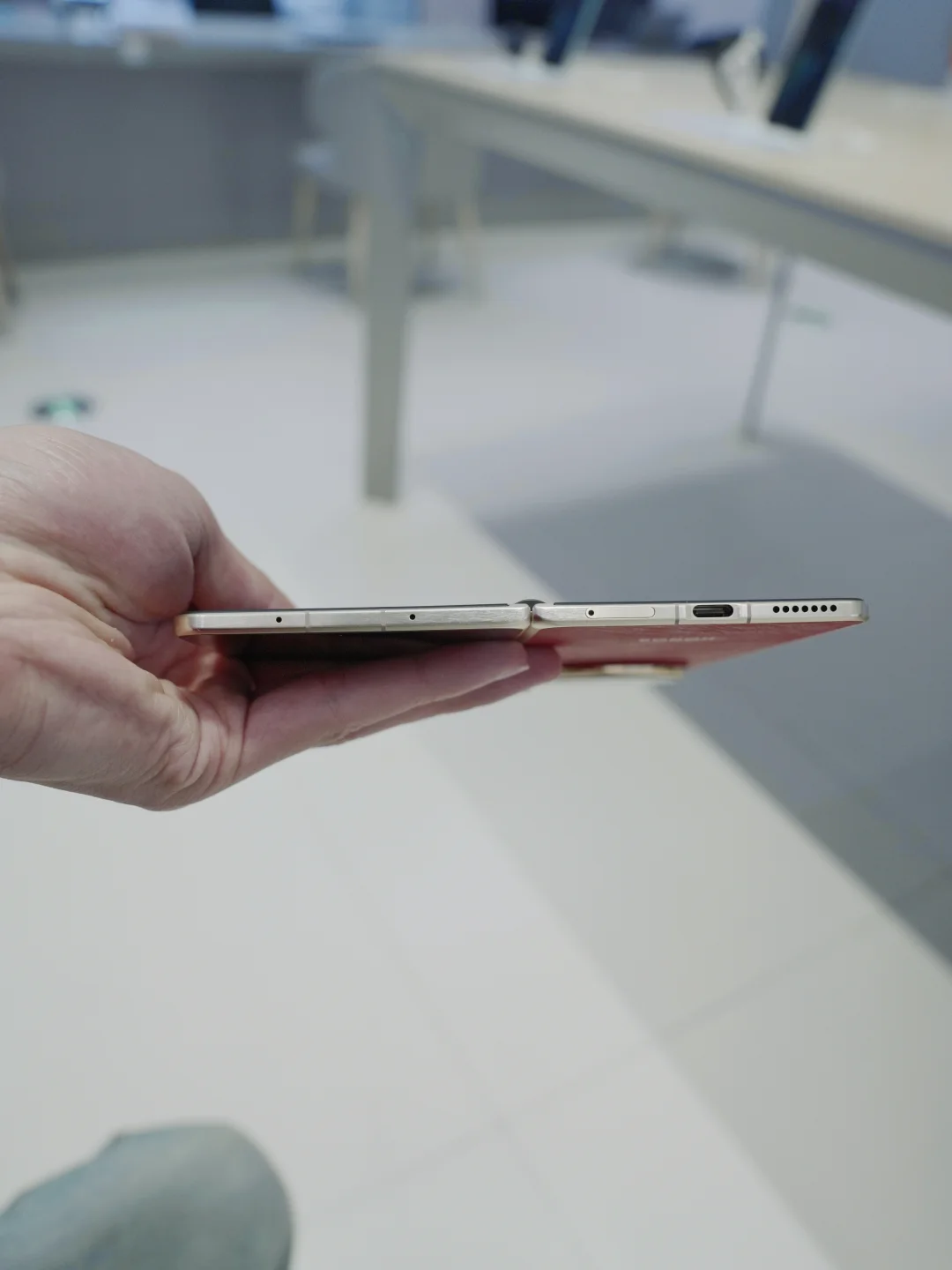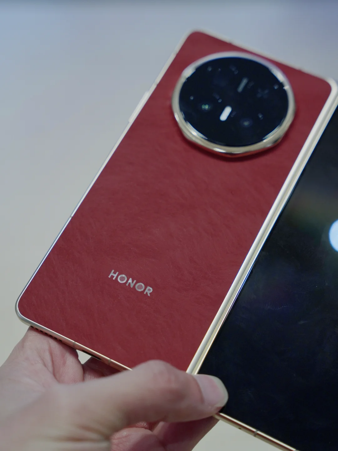 上手它给我的第一感受是很轻,毕竟体积是iPhone17Promax的大小,折叠起来还是两层,8.75mm的厚度-219g的重量就是感觉比直板机更薄。白色的只有模型我就没看了,红色是这次的主打色,仔细的摸了它的边框,背板材质是素皮搭配金属边框一硬一软更舒服。高级感和华为哪款x7有的一拼,其他几款颜色材质是羽纤和特种纤维,手感更冰凉,由于不是真机我就没拍了。