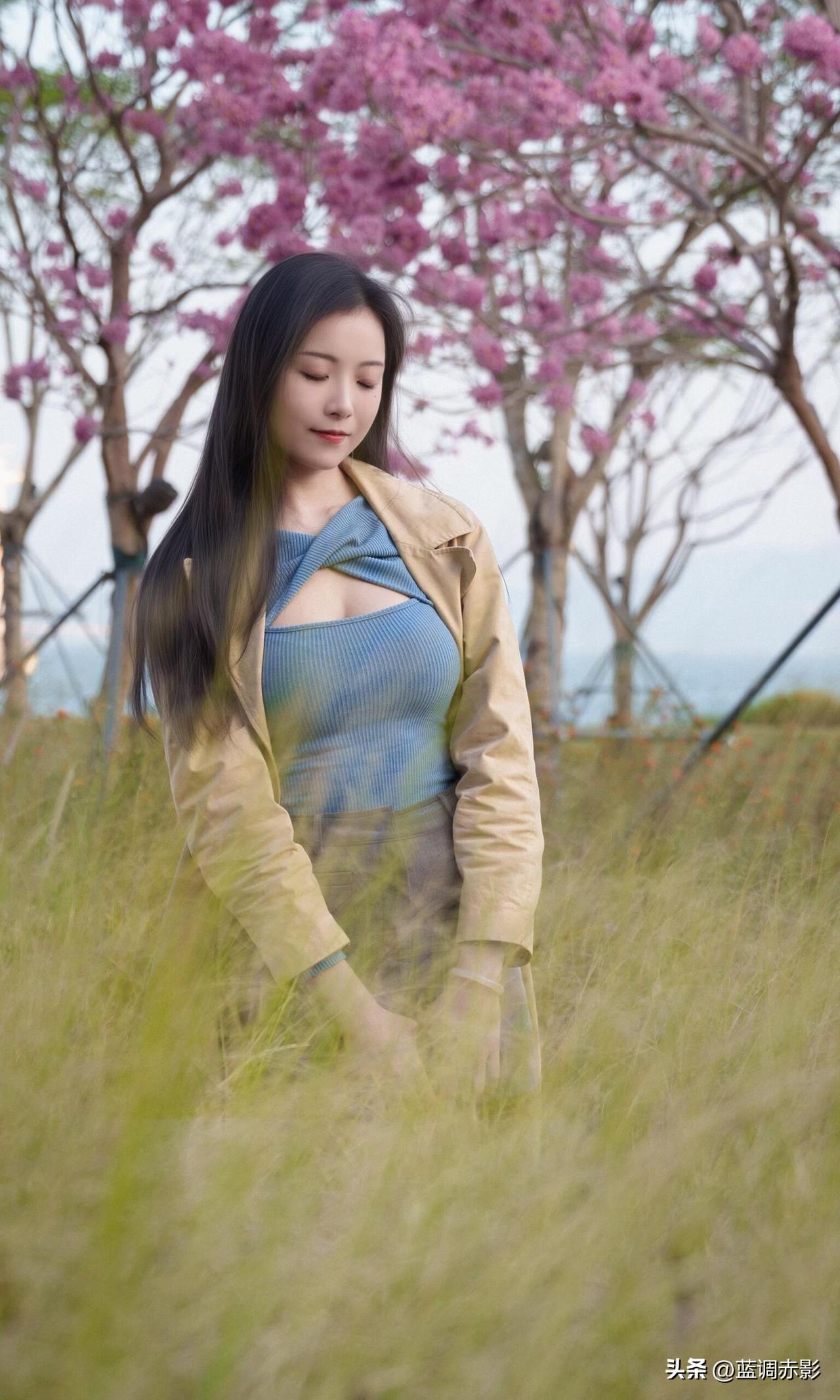 春日漫步,粉花映笑颜,轻抚花枝,感受自然之美。