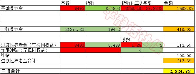 广东养老金! 有个友友考考我,发了这么一块截图给我,让算算养老金。 这个不难。 1、这是广东核定表的格式,并且是2026年退休。 2、指数小于0.6,只有0.4803,所以一定被a 3、96年7月参加工作,有视同缴费权益,因此没有年限津贴。 计算结果: 养老金是2324.78元,见图二。 大家看看对不对养老金2026养老金广东养老金[呲牙]