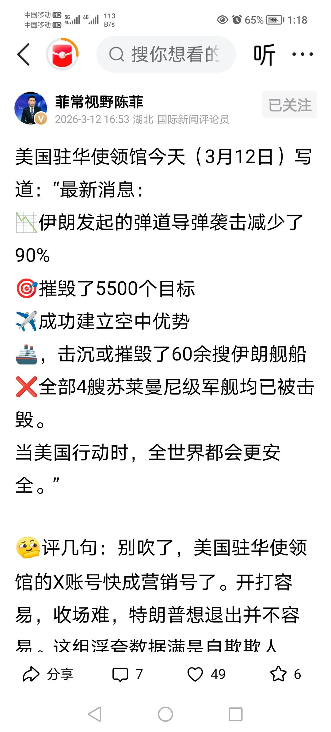 美国驻华大使馆:美国对伊朗的军事行动,让全世界会更安全! 美国驻华大使馆3月12日写道:“最新消息:伊朗发起的弹道导弹袭击减少了90%,摧毁5500个目标,成功建立空中优势,击沉或摧毁了60余艘伊朗舰船,全部四艘苏莱曼尼级军舰均已被击毁。当美国行动时,全世界会更加安全。” 其实,所谓“让全世界更加安全”显然是自吹自擂,只能说美国驻华使领馆敢说这话,只有美国自己不尴尬,尴尬的永远是别人。 首先,由于美国对伊朗军事袭击,使伊朗封锁了霍尔木兹海峡,此刻还被困在霍尔木兹海峡或者因此改道的各国商船肯定不会认同世界更加安全,还因此使国际油价大涨、相关股票市场大跌。近日,刚刚媒报道报道泰国货船在阿曼海北部被击中起火、造成3人失踪等已出现多起船只遇袭安全的事故。 其次,美国驻海湾阿拉伯国家27个军事基地遭伊朗报复袭击,造成重大人员及资产损失,使美国不得不安排相关人员或物资撤离相关基地。 最后,以色列本土由于伊朗不断的导弹和无人机报复性袭击,造成严重损失,人心惶惶,也感受到了加沙人民不安全的生活。 可见,美国对伊朗的军事袭击,世界并没有因此带来更安全。