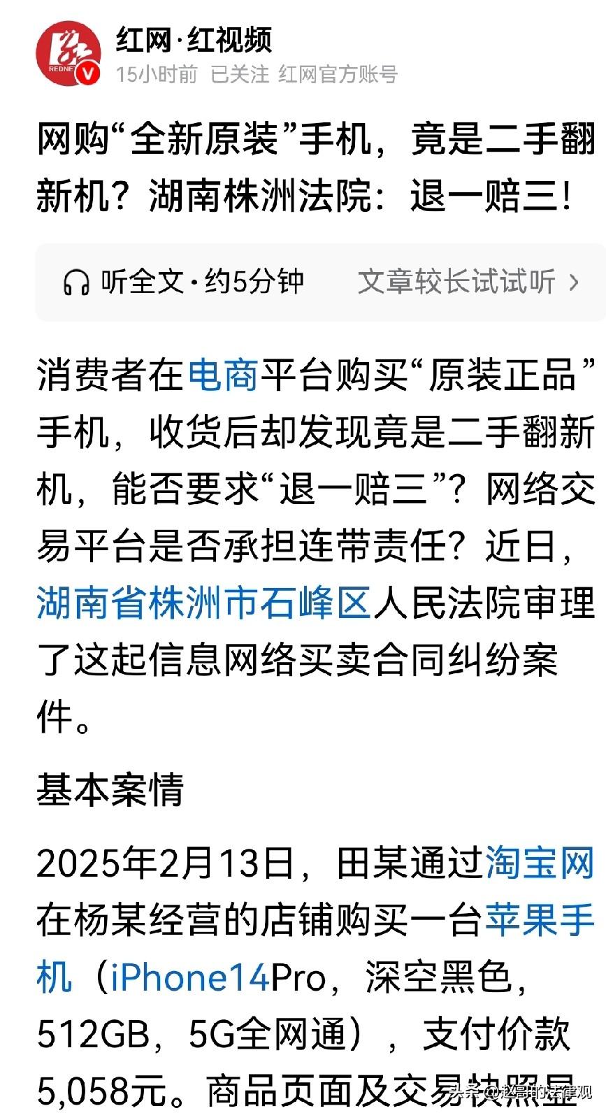 湖南株洲,男子趁着新年,想给自己换台新手机,他在网上店铺,花5058买了一台全新原装的iPhone 14 Pro。店家承诺:官网认证、支持专柜验货,保证手机拿回家能后自行激活。男子收到货,发现手机在2年前就被激活,再有两个月就过保修期了,是妥妥的二手翻新机,经过调解,店家只同意退货退款。男子不干了,将店家及某宝公司告上法庭,要求退还货款5,058元,以及3倍赔偿15,174元,法院判了! 2025年2月13日,田某网上选择了这家店铺的时候,还专门看了店家的宣传页。 他一直喜欢苹果手机,所以才花高价买下了这部苹果14。 当时店家承诺:支持爱思、沙漏、GSX各种软件验机,全国800多家售后随便测。 田某心想,既然敢这么说,东西肯定差不了,于是爽快地支付了5058元。 等待收货的那几天,田某心情忐忑,期待着到手的新手机。 可等手机到了手,田某刚用了没一会儿,就发现不对劲了。 这屏幕在低亮度下显示效果特别假,色彩看着也很别扭。 田某也是个细心人,他先没有找卖家,而是直接上苹果官网输入序列号查询。 这一查不要紧,真相简直给了他当头一棒:这台本该由他“自行激活”的新手机,早在2023年5月就已经被激活过了。 手机早被他人使用过,与商家宣传严重不符。 保修期居然到2025年5月,就截止了。 这哪是什么全新原装机,分明就是一台彻头彻尾的二手翻新机! 一个二手翻新机,就敢卖到5000多块钱,良心呢? 田某当时就炸了,这不就是明摆着骗人吗? 他先去找了淘宝客服介入,店铺商家杨某,自己干的事儿自己知道,他无话可说。 在平台的协调下,店家只同意退货退款,其他条件免谈。 但田某心里这口气咽不下去,这样的无良店家,如果只退货就完事了,那违法成本也太低了。 他觉得,店家这么干,属于典型的消费欺诈,必须让他假一赔三! 但店方的态度非常强硬:想要退货退款,马上就办,其他的,想都甭想! 多次沟通没有任何效果后,田某把卖家杨某、和某宝公司一起告到了法院。 法庭上,大家各执一词。店家老板杨某觉得挺冤,既然都退货了,凭啥还要赔这么多? 而某宝公司,也想赶紧撇清关系。 他们说,自己只是个提供信息的平台,不是卖货的。 而且,出事后已经把卖家的底细都告诉田某了,也把涉事商品下架了,他们不该承担连带责任。 法院经审理认为:首先店家这么干算不算欺诈? 按着法律规定,只要经营者提供的商品有欺诈行为,就得增加3倍赔偿。 店主杨某承诺:“原装正品”、“自行激活”,结果拿出来的却是提前一年多就激活的二手货。 手机这玩意儿,是新还是旧,对价格和消费者的购买意愿影响太大了。 你用虚假宣传把人骗进坑里,这就是板上钉钉的欺诈。 至于某宝公司,法院觉得它确实尽到了监管义务。 在纠纷发生后,平台配合提供了商家的信息,对店铺售卖的同类手机,做了违规处理。 因此,田某要求某宝公司承担连带赔偿的诉求没被支持。 最终,法院判决,杨某不仅要退还5058元的货款,还要额外支付3倍赔偿金15,174元。 这事也给习惯网购的人们提了个醒。 咱们买贵重物品时,别光看商家的宣传语有多漂亮。 那些所谓的“支持验货”、“全国联保”往往只是他们的护身符。 收货后,第一时间去官网查激活日期,这才是最硬的真理。 那些想靠翻新机,冒充新机赚钱的无良商家,如坑骗消费者被发现,等待他们的是三倍罚款。 诚信经营不是一句口号,而是实打实的法定义务。 消费者权益保护法第五十五条第一款:经营者提供商品或者服务有欺诈行为的,应当按照消费者的要求增加赔偿其受到的损失,增加赔偿的金额为消费者购买商品的价款或者接受服务的费用的三倍; 在文中,店家承诺卖给田某的是全新原装手机,实际交付的却是一台早已被激活的二手翻新机。 这明显与承诺不符,属于虚假宣传,已构成了消费欺诈。 人们购买商品时,通常会通过商家的宣传,来做决定购买还是不买。 店家的欺诈行为,损害了消费者的知情权和选择权。 消费者花了新手机的钱,却买到二手货,遭受了经济损失。 所以,田某有权要求店家退还货款,并给予三倍赔偿。 法院的判决,维护了田某的合法权益,也让店家为自己其欺诈行为,付出了代价。 那么,如果是你买到这种翻新机,你会选择息事宁人退货,还是像田某一样维权到底?