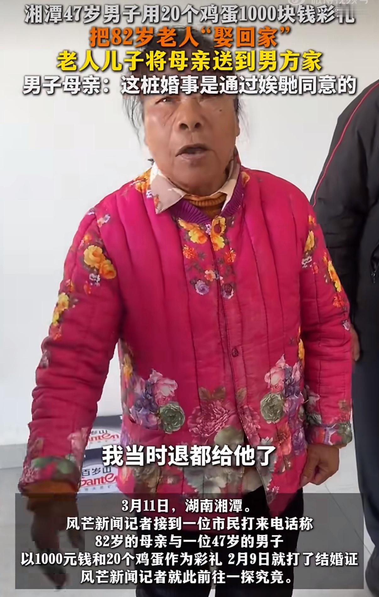 47岁男子1000元彩礼娶82岁老人1000块加20个鸡蛋,就把82岁的老人娶回家了。老人说自己以为是“假结婚证”,因为不识字。