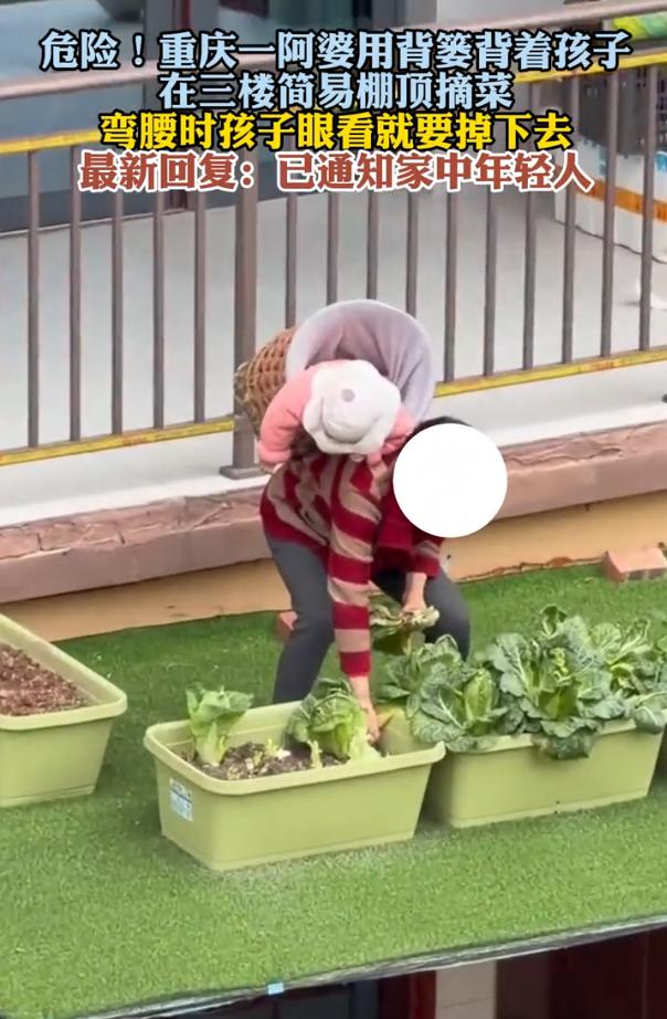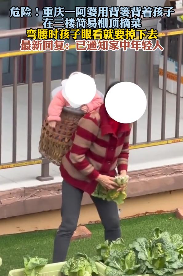 “太危险了!”重庆,女子在自家阳台望风,结果却看到对面楼,一位阿婆在三楼的简易棚顶摘菜,关键是,她还用背篓背着孩子,每次阿婆一弯腰,女子心里都跟着一颤,只能把这个事发到业主群进行提醒 从女子拍摄的视频来看,确实看着危险,阿婆把楼下的棚顶用来种菜,周围连围栏都没有,她就直接踩上去 那阿婆背上还背着个孩子,用那种老式的背篓,孩子就那么悬空在她身后。阿婆每弯一次腰去摘菜,孩子在背篓里就跟着往前倾一下,感觉随时都有可能从背篓里翻出来 这位女业主说,她就站在那儿看着,心都提到嗓子眼了。喊又不敢喊,怕突然一嗓子吓着阿婆,万一脚下不稳出事儿。不喊吧,这要是真出点啥意外,后果想都不敢想 最后她只能哆哆嗦嗦掏出手机拍了段视频,发到了小区业主群里。还特意在群里叮嘱了一句:回头大家见到了别凶老人,好好讲道理,提醒一下危险性 其实想想也能理解,老一辈人节俭惯了,看到楼下有个棚顶空着,就想着种点菜,家里吃着方便。背着孩子可能是没人帮忙带,走哪儿都得带着。但问题是,有些地方真不是能凑合的 棚顶就是棚顶,它不是阳台,更不是菜园子。平时刮风下雨,彩钢瓦本身就滑,再加上没有护栏,人站上去本来就危险,更别说还背着个孩子了 这事儿发到网上后,评论区也炸了。有人说自家老人也是,非要在六楼窗台外头焊个架子种花,怎么说都不听。还有人说,老人总觉得以前就是这么过来的,没事儿,但现在的楼房结构和以前的老院子完全不是一回事儿 说到底,还是安全意识的问题。老一辈人吃苦耐劳,啥地方都能将就,但有些将就可能付出的代价太大了 希望阿婆的家人看到业主群的消息后,能好好跟老人说说。不是不让种菜,是想办法在安全的地方种,或者干脆换个不危险的事儿干。至于孩子,还是尽量别这么背着上高地方了,万一有个闪失,后悔都来不及 老人背娃在棚顶摘菜 娃险些掉下去