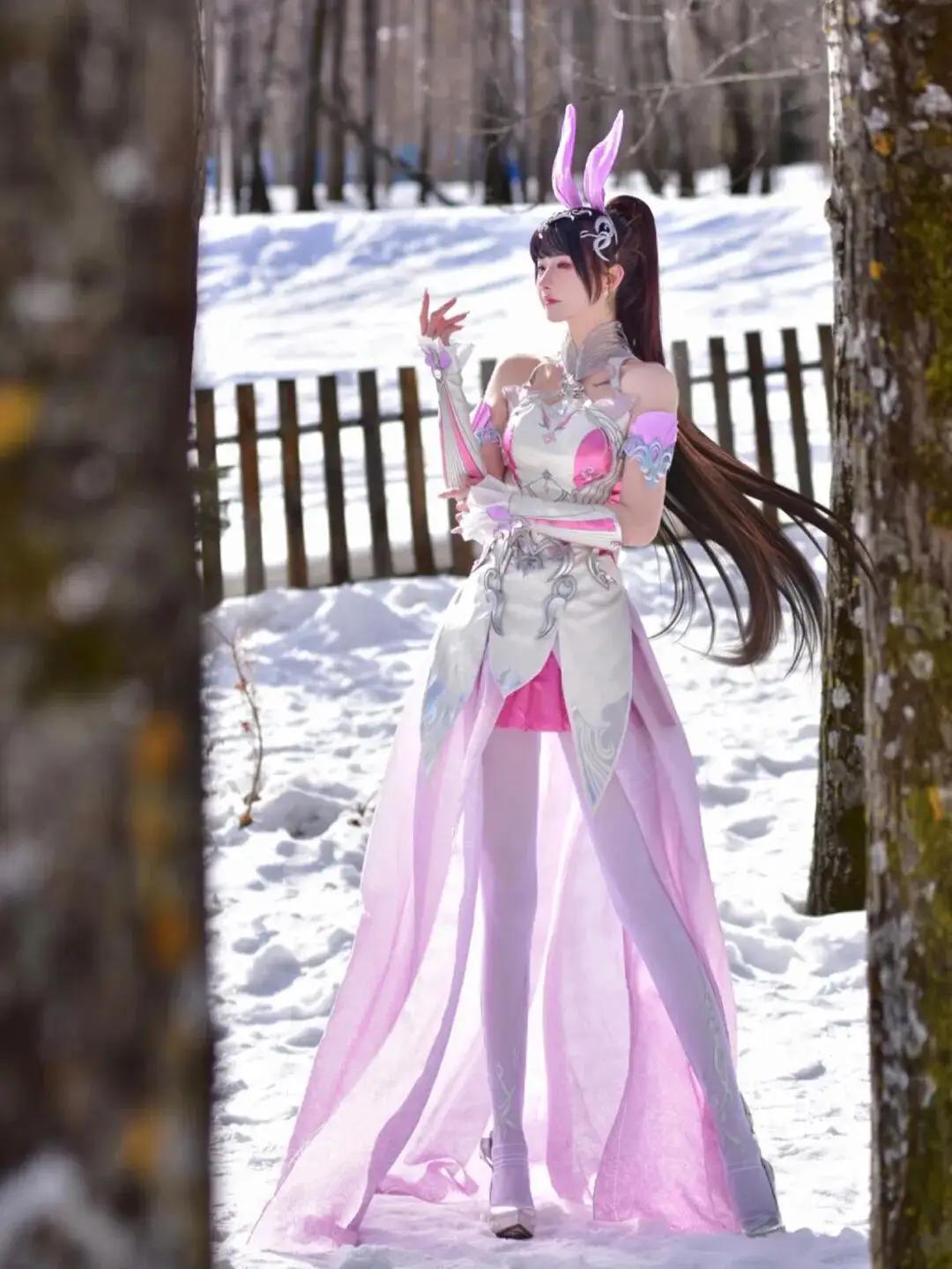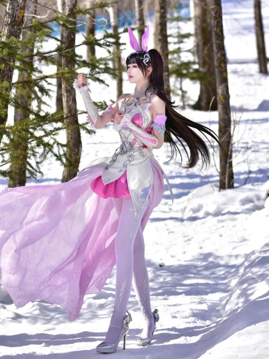 冬日森林中的梦幻兔女郎,粉色与白色的华丽装束,仿佛童话中的公主。🌨️💖👗