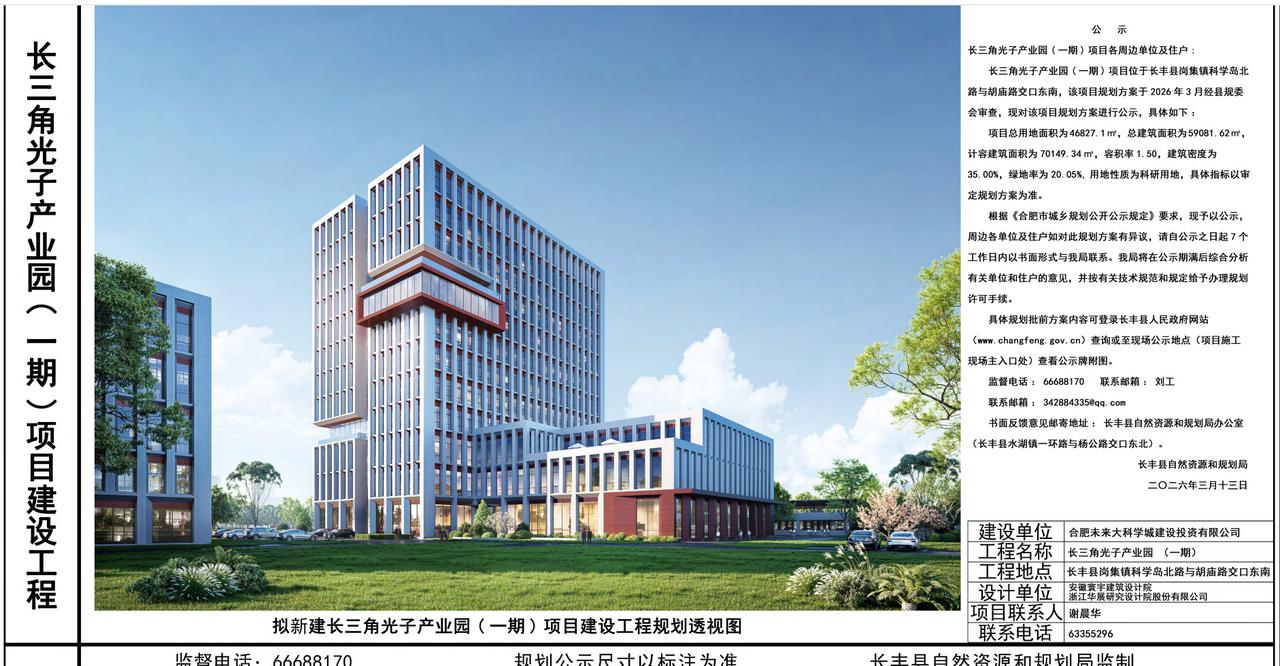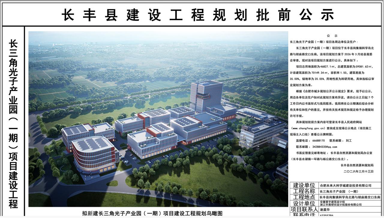 长三角光子产业园(一期)项目建设工程规划批前公示 位于长丰县岗集镇,合肥先进光源旁边