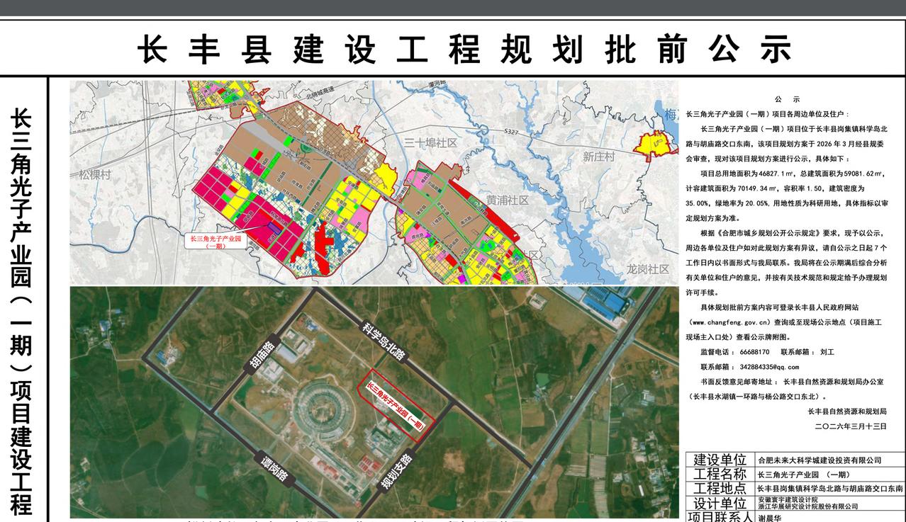 长三角光子产业园(一期)项目建设工程规划批前公示 位于长丰县岗集镇,合肥先进光源