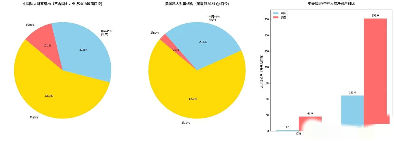 竟然被骗了。 之前有个帖子说中国92.6%的底层占3%的财富,我还发了个贴探讨了一番。 后经查证,他这个底层,是以财富更少的50%的家庭为标准的,那很明显,50%的家庭不可能占到92.6的人口,那一个家庭得多少人口啊?所以这个数据肯定是有问题的。 所以我痛定思痛,根据权威数据又重新做了一个表,数据来源为央行发布的《2019年中国城镇居民家庭资产负债情况调查》,以及美联储发布的Distributional Financial Accounts (DFA) 2024 Q4 值得注意的是,这个10.1%是加上农村家庭推算得出的,原报告仅计算了城镇家庭,为8.7% 比较反直觉的是,美国的贫富差距比我们更大。