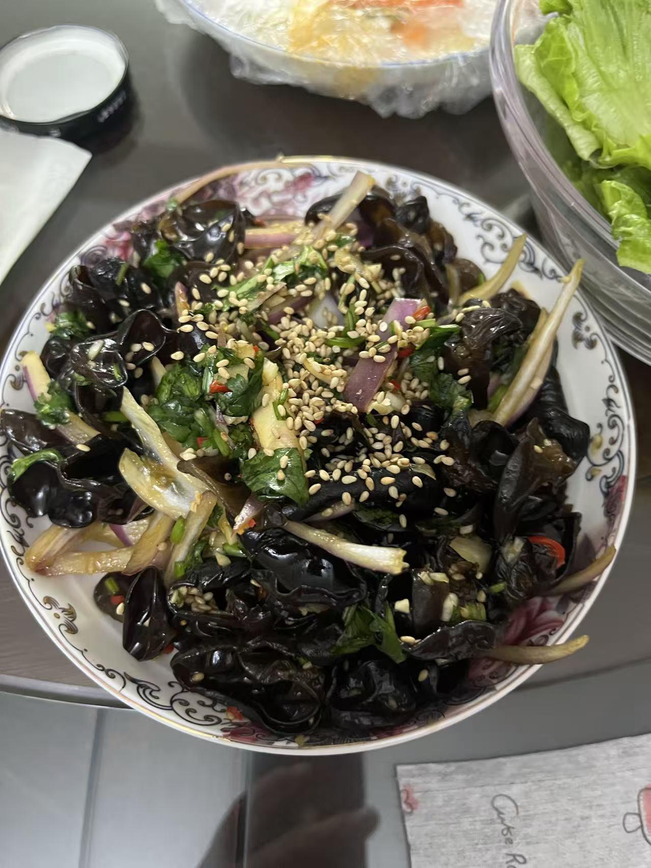 今天终于学会了做凉拌木耳了,放点紫色的葱头,比白色的提味!