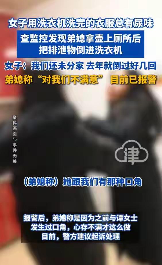 广西南宁,一女士对着镜头说:“真是没有想到,弟媳趁我们不在家,拿壶在厕所接了排泄物,径直倒进了洗衣机里!难怪这一年来,我洗的衣服总是有股怪味呢,太膈应人了,知人知面不知心!” 女子一家和弟弟一家是住在一起的,并没有分家,怪事大概是从一年前开始的,她发现自己用洗衣机洗衣服怎么洗都洗不干净,总是有一股怪味,她怀疑过洗衣机,也怀疑过洗衣液,洗衣机是拆拆洗洗、洗衣液也换了很多品种,最终衣服上的异味还会有。 这样的怪事持续了一年的时间,女子也不是没有怀疑过家人,但是没有证据说出来怕影响一家人的团结。实在忍受不了,她花钱在家中安装监控,没想到的是,这样做直接让她发现了弟媳做出如此过分的一幕。 通过监控视频发现,弟媳每次趁着女子不在家,都拿着壶去厕所接了排泄物,然后悄悄倒在洗衣机里,太恶心了。女子看视频就发现了不止一次,而是持续的做了很长一段时间,这明显显的打击报复行为。 想想家人都是用这台洗衣机洗衣服的,弟媳的行为浪费女子反复洗衣服的时间和精力,还让人长时间闻着异味的衣服,直让人反胃。 人在同一个屋檐下,哪有牙齿不碰舌头的,之前弟媳和女子发生过口角,弟媳不服气,就想着打击报复,于是就有了这个做法,这纯纯的恶心人,关键是还持续了这么长的时间,女子直呼:“接受不了。” 对此有网友表示:这样的做法太恶心了,同是一家人、同住一个屋檐下,做出这种事情真是太没素质了,必须追究责任! 也有网友表示:女大嫁人,儿大分家,是天经地义的事。距离产生美,与其这样,不如分家好了,免得挤在一起矛盾还多,到时候伤情分。 有今世做兄弟,没缘分对面不相逢。亲人之间难免会磕磕绊绊的,有矛盾纠纷不可怕,摆在明面上谈谈解决就好了,真没必要采用这种极端的方式报复,这样的方式只会让矛盾激化,妯娌之间的关系越变越差,伤情感,甚至演变触犯法律。 鉴于事情已发展至此,弟弟弟媳应该好好向姐姐一家道歉,主动赔偿点,然后和姐姐一家分家,这样彼此的关系才不会彻底破裂,维持好彼此的体面不是! 对此,你怎么看?
