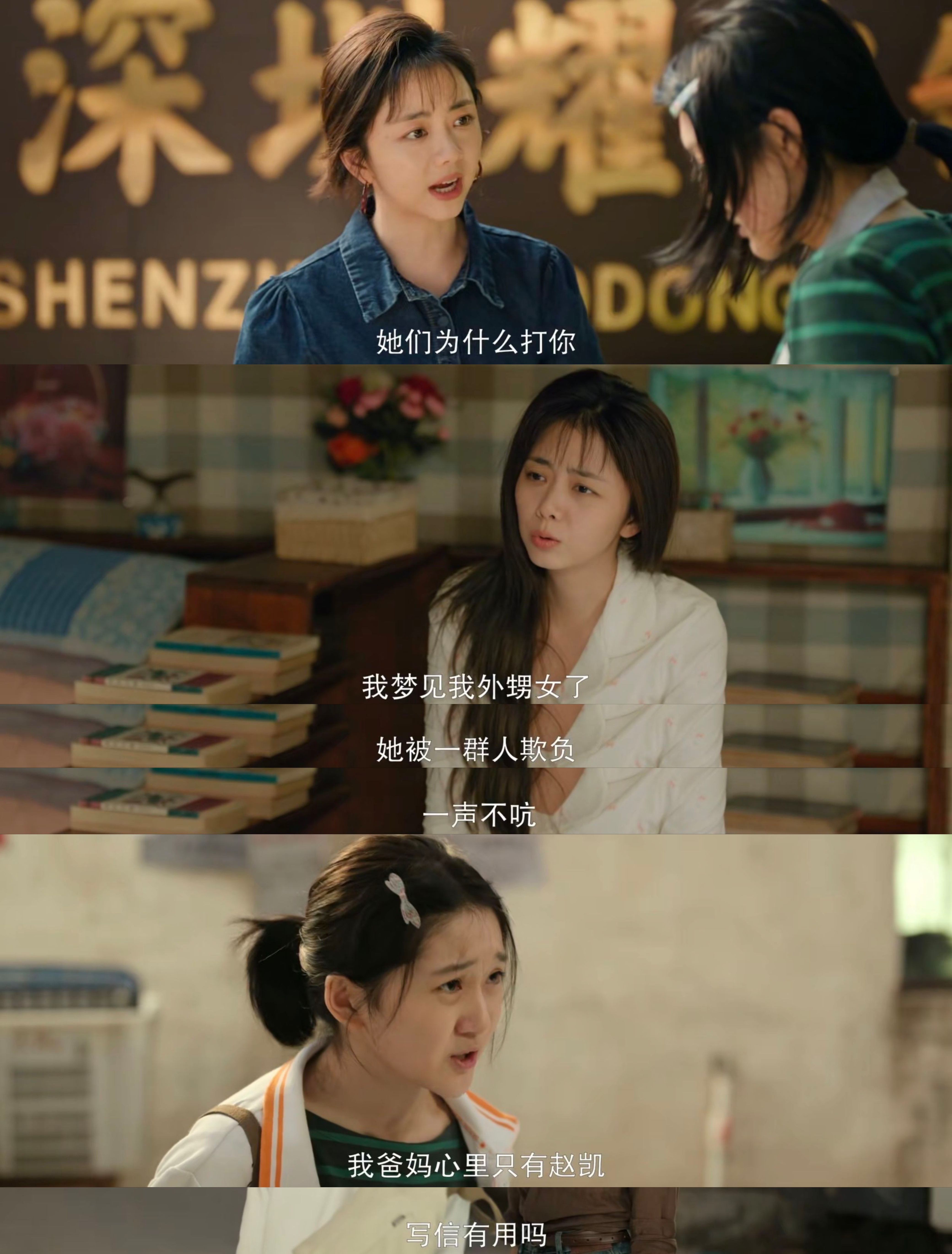 《我的山与海》在这儿还安置了一个支线——外甥女赵俊。方婉之的生活尚且自顾不暇,为何还要去管赵俊的“闲事”,其实,只要看完这两集,就会发觉,赵俊像极了另一个方婉之,她逃离家乡与被安排的婚姻,不正也是想要改命么?在工厂被欺负不还手,除了方婉之口中的“在家没人疼,出门腰杆能硬吗”,更重要的是,赵俊想要改命的决心一遍遍催促她撑住,就像方婉之来到深圳,在那些底层工作中摸爬滚打,不也是改命的决心在支撑她么,所以当方婉之望见赵俊,就像照镜子一般,看见了两个自己,她给予赵俊反抗的力量,是女性力量的传递,又何尝不是,一场自我鞭策呢。