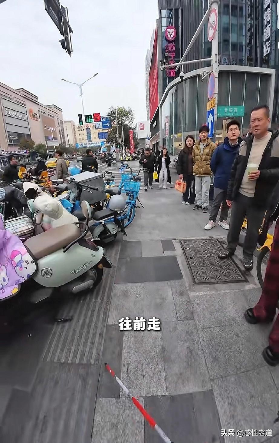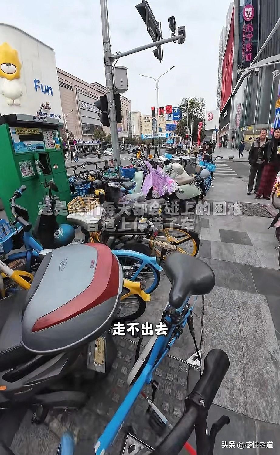 盲人的盲道你还忍心占用吗?一位盲人博主在南京新街口。被盲道上的石头绊倒并摔了一跤。很多路过的市民以及好心人帮助她找到目的地。 但我关注的点并不是热情的南京市民,而是盲道上密密麻麻被占满的电动自行车。你很难想象盲人出行的困难究竟有多难?这个视频里这位盲人朋友在盲道上如同被鬼打墙了。前后左右全是电动自行车。就是,转不出去。在视力正常的人眼中,跨一步就可以解决的问题,但是在盲人感触当中根本过不去。因为他们是靠盲杖来指引方向当四面全是电动车的时候,你告诉我你怎么出去? 盲人这个群体其实数量不少。但就因为出行不便,才让他们不想出门,不愿出门。谁不想感受四季的变化?谁不愿意接受自然空气?有关部门能不能对盲道进行一次清理,进行一次整改呢?让每个盲人都能够愿意走出家门,感受春天的气息。这个国家是每一个人的,是你的,是我的,同样也是盲人的。
