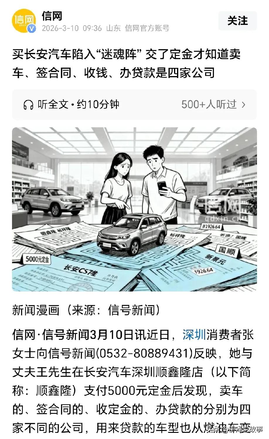 交钱才发现买车竟被四家公司分尸?退定金跑断腿,4S店套路太深! 2026年1月,深圳的张女士夫妇在顺鑫隆店看中一辆CS75燃油车,当场交了5000元定金。等拿到文件才傻眼——卖车的是顺鑫隆,收钱的是新景元,签合同的是裕祥隆,办贷款的是国顺汽贸和融资租赁公司。说好的燃油车,贷款系统里却变成了新能源款;月供从1908元跳到1926.64元,来回变了三次。想退钱?四家公司开始踢皮球,张女士跑断腿也不知道该找谁。 厂家客服查了半天,告诉张女士:顺鑫隆和国顺是授权门店,裕祥隆和新景元只是二级网点,没授权。可张女士明明踏进的是顺鑫隆的门,最后却和二级网点签了合同。这操作有多骚?销售张口就骗说“都是一家公司,内部流程”,实际上是把一辆车拆成四截,每一截都能赚一道钱,出了问题谁都不用负责——消费者就是那个唯一的责任人。 贷款预审时,易鑫融资的工作人员给张女士丈夫递了张纸条,让他照着念回访电话。为什么?因为贷款车型根本不是他要买的那款,而是挂着长安标的电动车。事后人家解释:预审二维码是通用的,默认绑新能源,方便审批。多贴心啊,贴心到连消费者买啥车都不用知道。银行车贷利率普遍3%,这笔贷款年化飙到10.32%,差额进了谁口袋?用脚趾头都能想明白。 更绝的是,销售当初拍胸脯说“贷款不通过能退钱”,结果贷款批了,月供高了,车型变了,他们反而说“批了就不能退”。张女士报警,警察说民事纠纷,自己协商;找市监局,回复“建议协商”。一圈下来,四家公司互相推:收钱的让找签合同的,签合同的让找办贷款的,办贷款的让找卖车的,卖车的说钱不是我收的。好家伙,一套太极拳打得行云流水。 业内人士点破天机:这是集团内部业绩分配的骚操作,把简单购车拆成四截,门店拿提成,二级收钱,金融吃利差,人人有肉吃。但商家有义务告诉消费者吗?没有。因为他们要的就是你不知道,等你发现,定金早进了别人口袋。张女士夫妇第一次买车,啥也不懂,销售全程用嘴忽悠,合同上啥关键信息都不写——这不就是专挑老实人下刀吗? 好在媒体曝光后,顺鑫隆终于松口,答应7个工作日内退款。张女士在社区警务室签了协议,这场闹剧勉强收场。可还有多少人正走进同样的店,签着同样的合同,等着被四家公司“分尸”?车市价格战打得凶,利润薄了,套路就厚了。当你以为捡到便宜时,可能正被人按在砧板上。买车的记住:定金别乱交,合同看清甲方,贷款问清利率,销售的话,一个字都别信。【来自懂车帝车友圈】