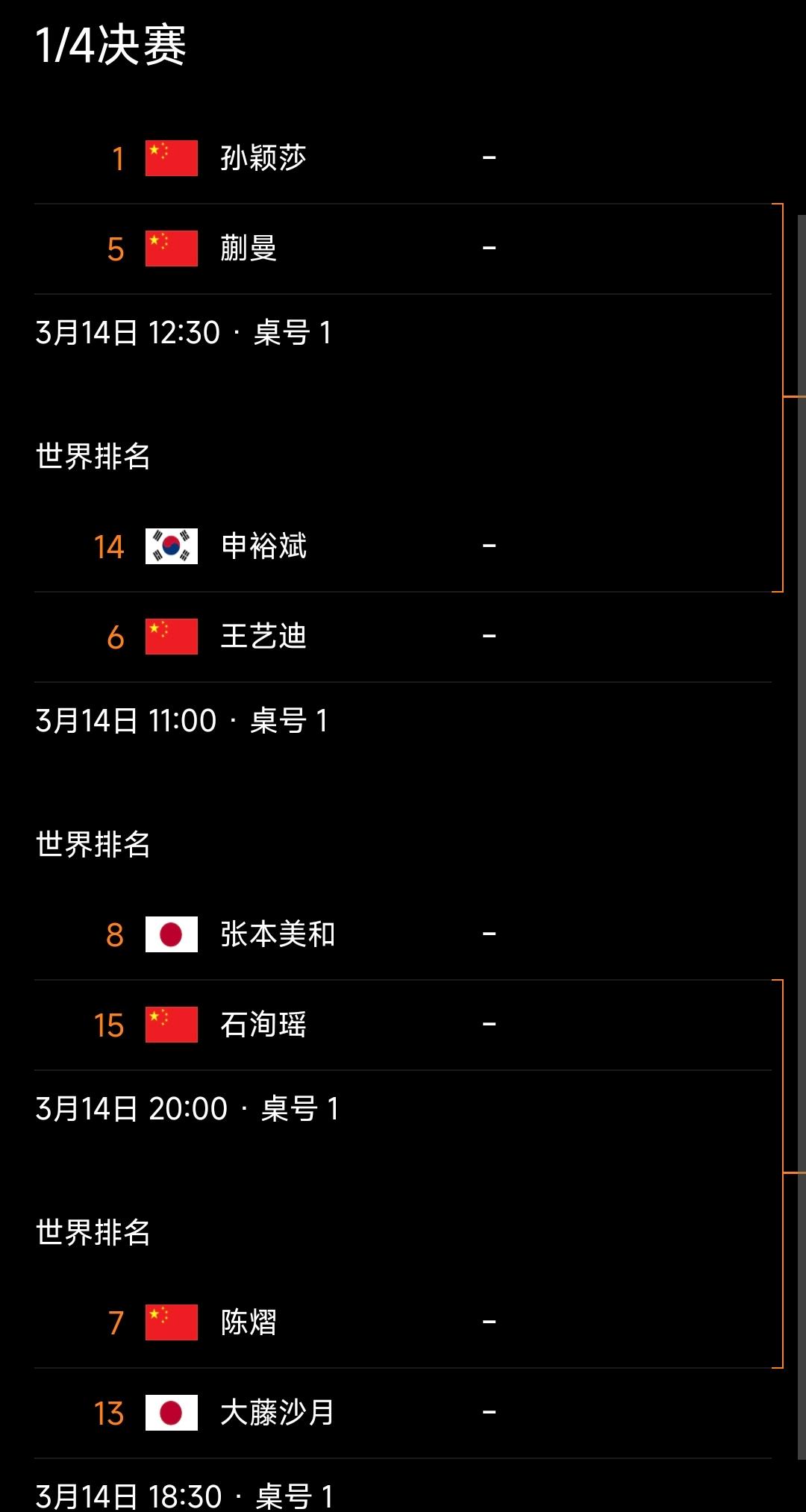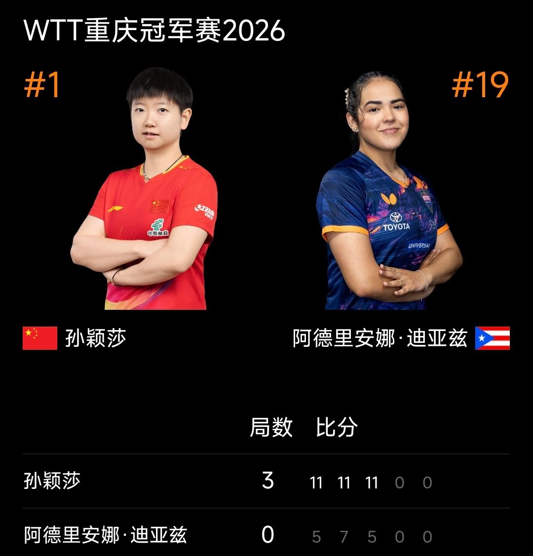 国乒孙颖莎等5人晋级女单八强! 2026重庆冠军赛 女单1/8决赛结束,国乒孙颖莎、蒯曼、陈熠等战胜各自对手晋级八强!陈幸同与队友石洵瑶激战四局,石洵瑶胜出! 1/4决赛对阵: 孙颖莎vs蒯曼 申裕斌vs王艺迪 张本美和vs石洵瑶 陈熠vs大藤沙月 孙颖莎作为头号种子,具备夺冠的实力,尤其是在队友王曼昱出局后,孙颖莎成为了最后的屏障! 外协高手张本美和、申裕斌都相当有实力,国乒加油! 四场比赛,三场外战都是硬战,大藤沙月战胜了王曼昱,士气旺盛;张本美和冲击力强劲,石洵瑶承压;申裕斌最近一段时间表现相当不错,涨球不少! 国乒加油!
