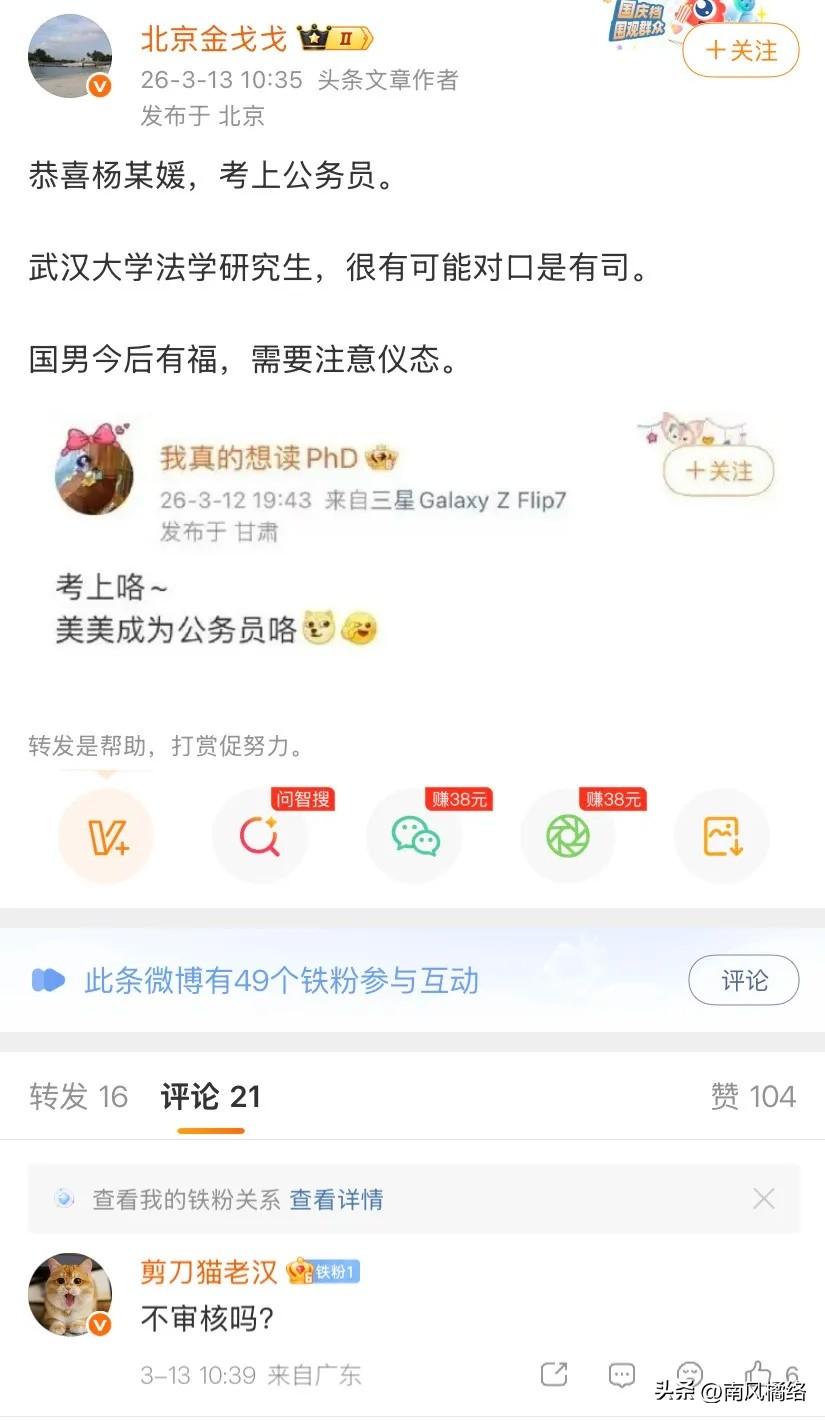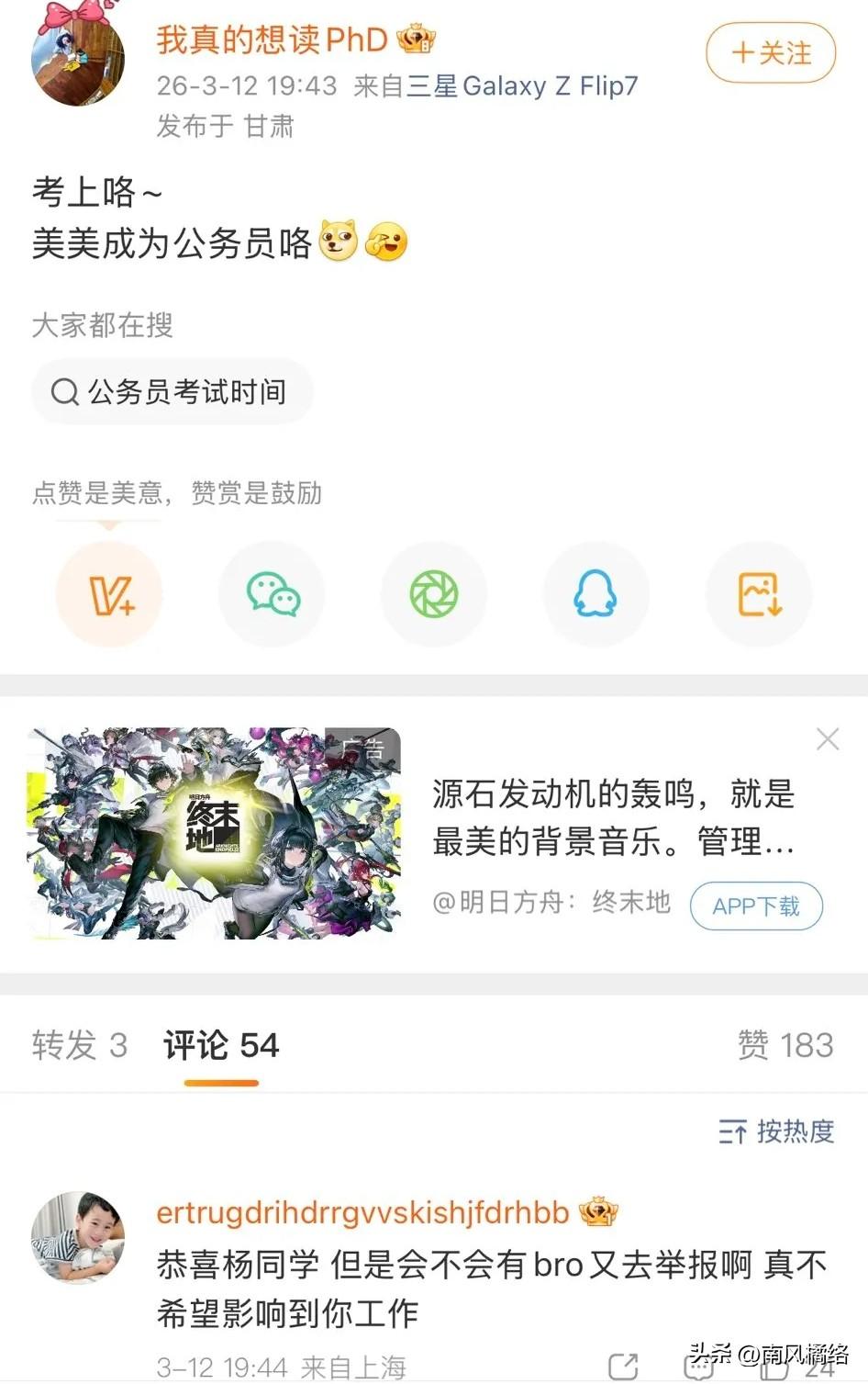 武大诬告学弟事件当事人杨某媛,3月12号发帖,称自己考公成功了,现在被很多网友质疑: 这个是不用政审的吗? 这条自己考公上岸的帖子,才刚被发出来,就被很多的网友质疑,当初诬告学弟的黑历史还在,政审这关怎么可能会通过呢?面对这么多的质疑,她的回应直接让人大跌眼镜。 3月12号,杨某媛在社交平台上面晒出了疑似公务员录用的相关内容,配文称“终于上岸”,不少的网友看到后,马上想到了她当年诬告学弟偷拍的事件,纷纷去留言质疑:“政审难道不查过往品行吗?” 眼看着舆论发酵,杨某媛马上改口,称考公上岸只是个玩笑,“就喜欢看网友们被他戏耍的样子”,而早在数年前,她就曾诬告同校学弟偷拍,后来经过了监控视频的澄清,学弟才得以清白,但这件事情对学弟造成的学业、心理影响,到了现在都还让很多的网友耿耿于怀。 公务员政审的严格程度,远超普通人的想象,除了审查自己的直系亲属的违法记录外,还有个人的品德、过往的诚信记录更是重点考察项目,像诬告他人这种涉及恶意造谣、损害他人名誉的行为,显然是不符合公职人员的品行要求的。 当年的诬告事件发生后,学弟就曾因为被调查耽误了课程,甚至一度的面临学业危机,尽管现在真相大白了,但杨某媛到了现在都没有做出足够甚至有诚意的道歉,也没有受到什么相应的校纪处分,这让很多的网友觉得她并没有为自己的错误付出代价。 考公在很多人的心里面,是改变命运的严肃途径,不少人为了备考,甚至放弃了娱乐、熬夜刷题,付出了数年的努力,杨某媛拿如此重要的人生选择开玩笑,不仅是对学弟的二次伤害,更是对所有为考公拼搏的人的不尊重。 杨某媛的一系列行为,背后是典型的侥幸心理作祟,当初诬告没有受到严惩,让她误以为可以肆无忌惮的突破规则底线,她看起来戏谑的态度,实际上已经暴露了他对他人的感受、社会规则的漠视,甚至带有一种“我错了又怎样”的傲慢。 公众的愤怒,本质上是对公平的维护,大家在意的不是杨某媛个人的对错,而是担心“犯错不受罚”的示范效应会侵蚀着社会的信任,如果恶意造谣的人能毫无负担地拿严肃的事件来取乐,那努力守规的人又该如何自处? 从诬告学弟再到拿考公开玩笑,杨某媛一次次的挑战公众底线,也让大家看到了小错不纠的危害,其实我们更应该思考的是,如何在错误发生的时候及时的介入,让犯错的人真正认识到问题所在,而不是等到矛盾激化了才引发舆论的关注,毕竟,比起事后指责,事前的引导和约束才是更有效的方式。 有网友愤怒留言:“拿考公造谣取乐,对制度和受害者太漠视了吧!” 这条评论直接就戳中了很多人的痛点,毕竟没有谁的梦想该被拿来随意戏耍。 说真的,看到杨某媛的操作,我真是又气又无奈,当年他诬告学弟,现在又拿考公出来开玩笑,这哪是“调皮”,根本是没心没肺,考公这条路有多难走,只有经历过的人才懂,她倒好,拿来当逗网友的工具,换谁能不寒心,希望她能好好反思,别再消耗大家的善意了。