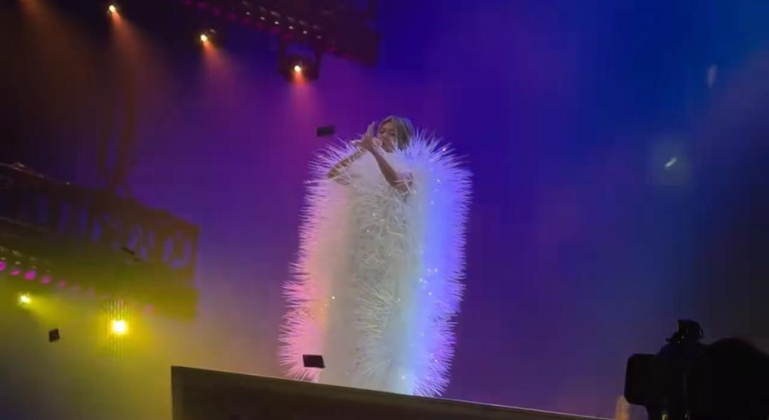 这哪是舞台女王啊,这分明是一颗修炼成精的超大号白海胆。 浑身上下都支棱着“尖刺”,连胳膊都快被藏没了,真的生怕她一抬手,就把旁边的伴舞给扎到了。 咱就是说,造型师是不是对仙气有什么奇奇怪怪的误解啊。