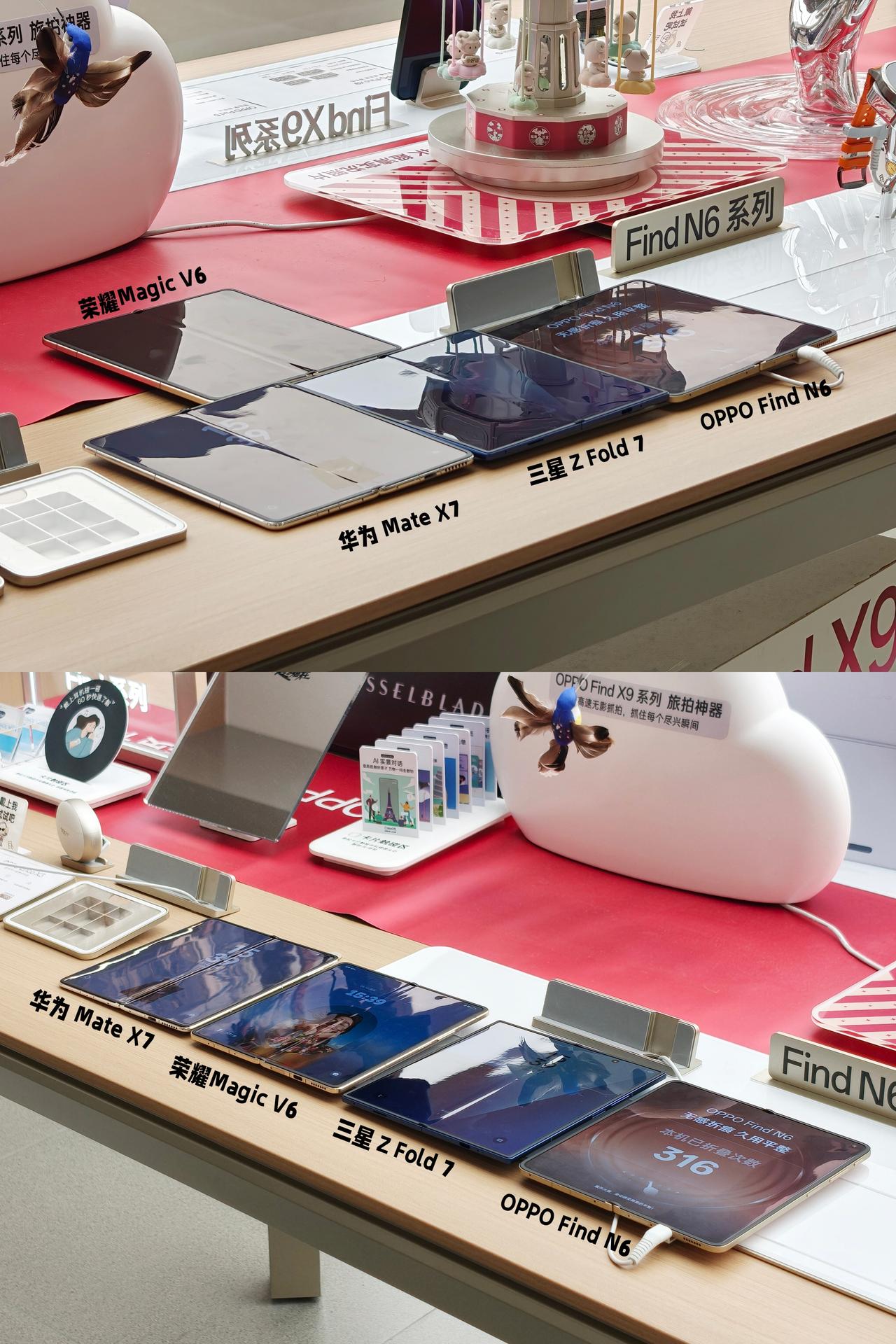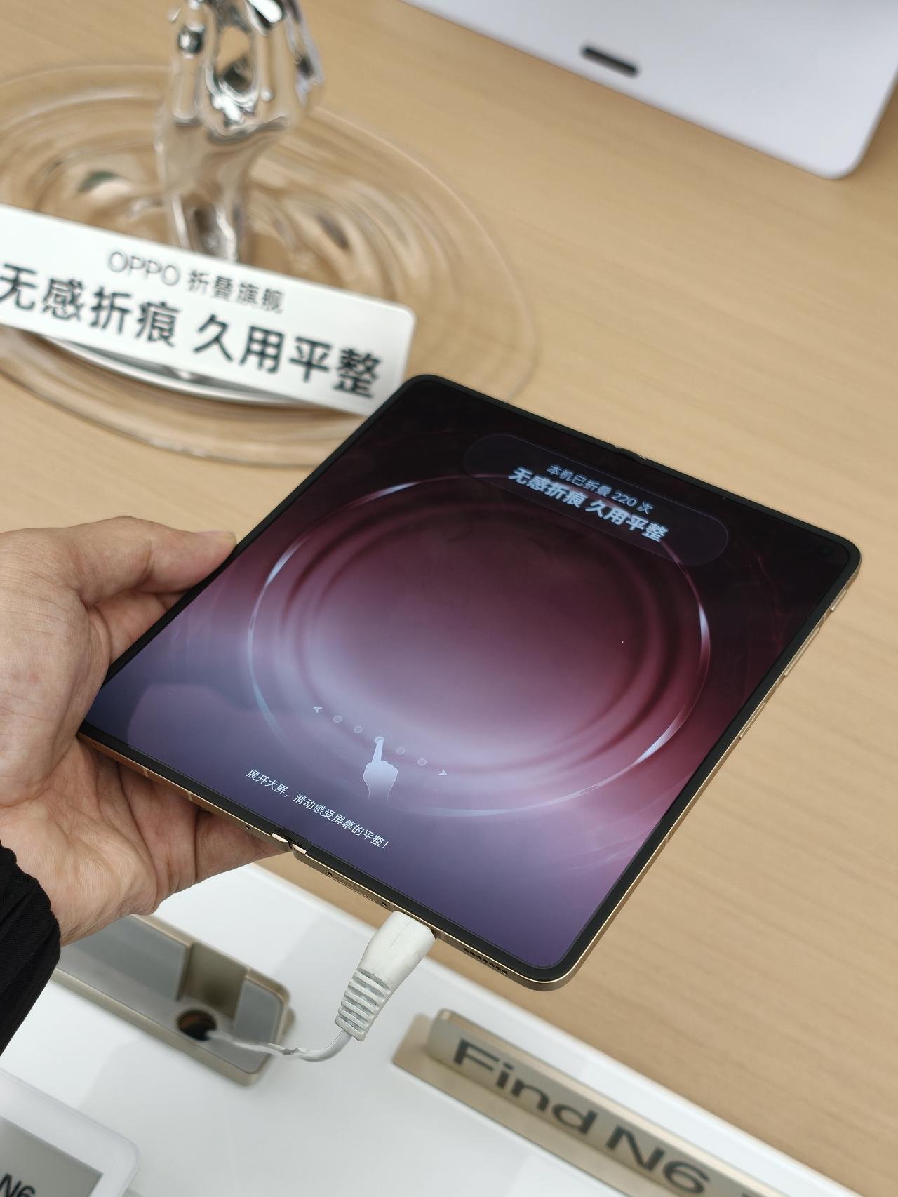 折痕一对比,我开始纠结换不换Find N6了 - 买的荣耀Magic V6拿到了,非常商务大气,也很轻薄,折痕控制也ok,但我看到隔壁OPPO Find N6快要发布了,宣传的无感折痕看起来很厉害的样子,为了一探究竟,下班后特地去了趟OPPO店,我还带上华为MateX7和三星ZFold7。 - 有点离谱,没想到Find N6屏幕这么平整,侧着的角度还是很难看到折痕,手指滑过去没有沟壑感,三星和华为多少能看到折痕,荣耀会稍微好一点。 - 毕竟折痕在日常使用中很重要的,屏幕平整看视频、PPT体验会更好,而且OPPO Find N6有莱茵60万次久用平整认证,用好多年都很平整,不用担心以后折叠屏不好用。 - 你们说等OPPO发布吗?😂 - OPPOFindN6 折叠屏手机 三星ZFold7 折叠屏推荐 数码大玩家 一起聊数码 新手机 OPPO FindN6无感折痕