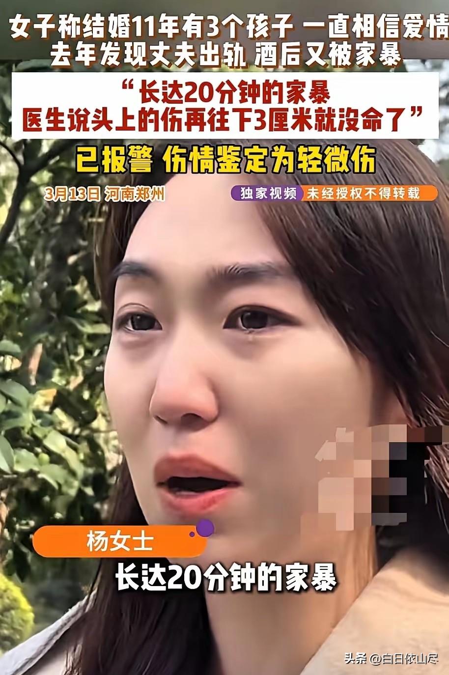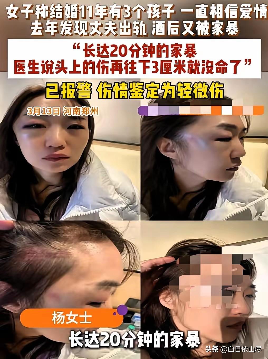 这是人干的事吗!河南郑州,女子结婚11年生了3个孩子,本以为嫁给了爱情,然而去年发现丈夫居然出轨,酒后更是殴打女子,女子遍体鳞伤,幸亏女儿报警,医院医生说:“头上的伤再往下3厘米可能就没命了!” 坚守十一年婚姻,接连生下三个孩子,原以为是奔赴幸福安稳的生活,河南郑州的这位女子,却在去年撞破了婚姻最不堪的一面,更在酒精引发的暴力中,险些失去生命。 这段婚姻从满怀期待开始,女子将十一年的青春全部投入家庭,先后孕育三个子女,日常围绕孩子与家庭琐事奔波,一心想着把日子过好,把孩子抚养长大。 她始终坚信自己嫁给了最初认定的感情,即便生活平淡琐碎,也从未有过放弃的念头,直到去年,丈夫的异常行为打破了所有平静。 女子在整理家中物品时,意外发现丈夫背叛婚姻的痕迹,多年的付出与信任瞬间崩塌,内心的委屈与绝望难以言说。本以为对方会心生愧疚收敛行为,没想到这场发现,竟成了暴力的开端。 丈夫不仅没有反思自身行为,反而将情绪发泄在女子身上,尤其是在饮酒之后,情绪完全失控。 事发当晚,丈夫饮酒归家后再次与女子发生冲突,失去理智的状态下,对女子实施了暴力行为。 拳脚落在女子身上,没有丝毫顾及多年夫妻情分,更没有在意身边年幼的孩子,整个过程粗暴且凶狠,女子无力反抗,身体多处出现明显伤痕,头部遭受重击后失去反抗能力,意识逐渐模糊。 家中的孩子目睹了这可怕的一幕,年纪稍长的女儿在恐惧中做出了最勇敢的举动,第一时间拨通了报警电话求助,正是这个及时的举动,为母亲争取了活下去的机会。 警方与医护人员抵达现场时,女子已经浑身是伤,头部伤势尤为严重,被紧急送往医院进行救治。 经过医生全面检查,女子身上遍布新旧伤痕,头部的伤口距离关键部位仅差三厘米,稍有偏差便会危及生命,连专业医护人员都为这一伤势感到心惊。 医院的诊断记录清晰记录下伤势的严重程度,每一处伤痕,都在诉说着这场家庭暴力带来的伤害。 十一年婚姻,三个年幼的孩子,没能成为温柔相待的理由,反而让女子在隐忍中承受更多伤害。 从最初憧憬爱情,到遭遇背叛,再到酒后暴力相向,曾经温暖的家庭,变成了让她恐惧的地方,朝夕相伴的人,变成了伤害自己最深的人。 女子躺在病床上休养,身体的伤痛可以慢慢愈合,可内心的创伤与对婚姻的失望,早已无法弥补。 她为家庭耗尽青春,放弃了属于自己的生活,换来的不是珍惜与呵护,而是身体与精神的双重折磨,若不是女儿果断报警,后果不堪设想。 整件事被曝光后,无数人关注到这位母亲的遭遇,大家为她十一年的付出感到不值,也为孩子在恐惧中成长感到心疼,更对这种突破底线的暴力行为感到愤怒。 对此,你们有什么看法,欢迎评论留言~