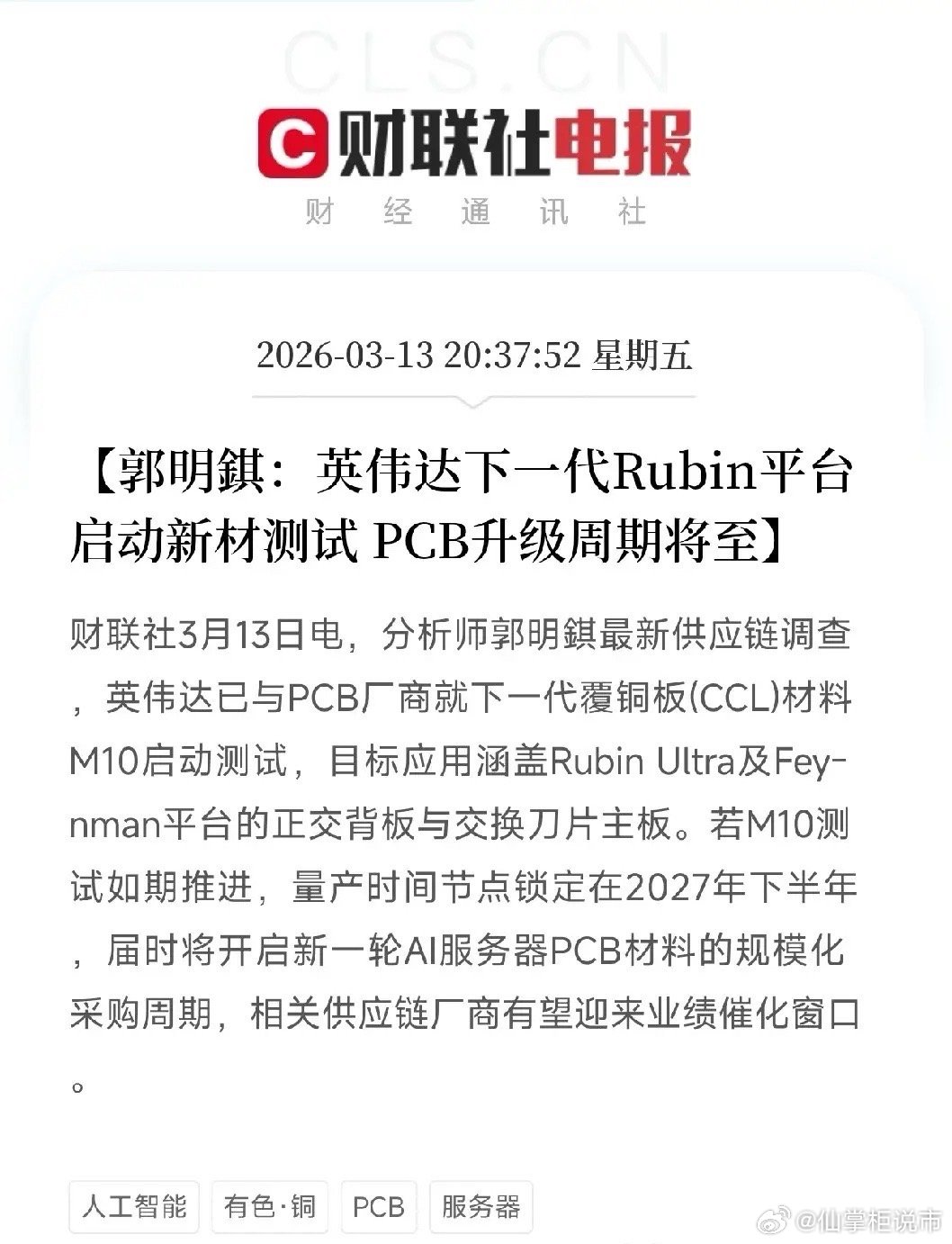 第二,PCB的大规模采购周期定了!消息里明确说了:量产时间锁定在2027年下半年。别觉得远,资本市场炒的就是预期。一旦M10测试顺利推进,从现在开始,供应链就要进入备货、扩产、业绩释放的长景气周期。