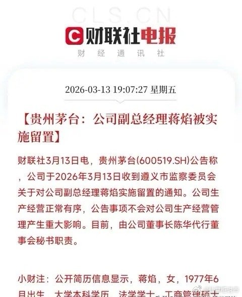 第一雷:贵州茅台高管被查贵州茅台副总经理、财务总监、董秘蒋焰被依法留置调查。其在茅台任职超十年,手握财务、信披核心大权,此前还多次出席业绩说明会。这是茅台继袁仁国、高卫东、丁雄军之后又一高管落马,作为A股市值一哥、白酒板块压舱石,影响深远。