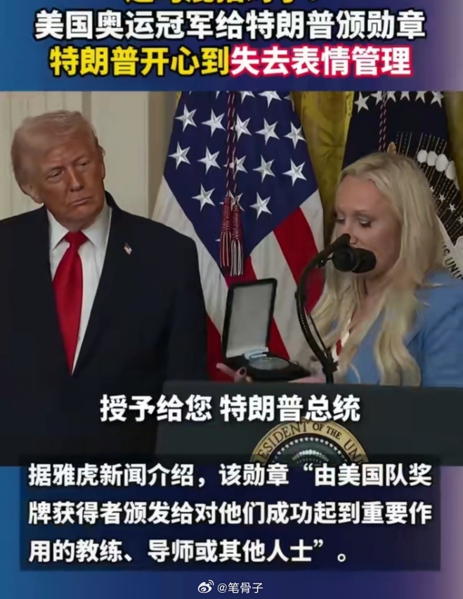中东伊朗最新局势特朗普被奥运冠军颁勋章开心到表情失控这回马屁算是拍出了奥斯卡级别的水准!美国奥运美女冠军给特朗普颁勋章,老特那表情,简直是“笑到面部肌肉集体罢工”,开心得都不知道手往哪放了。