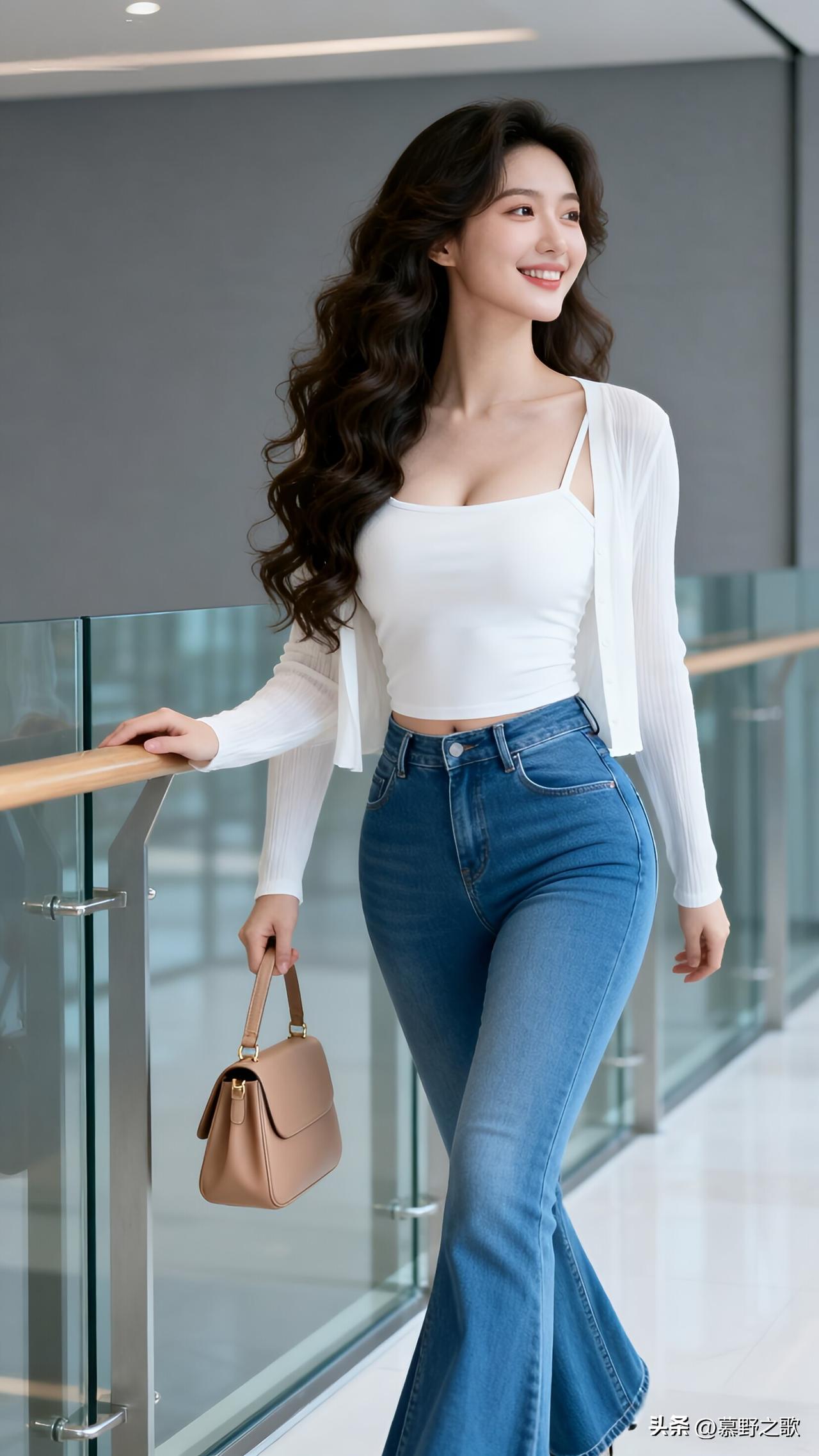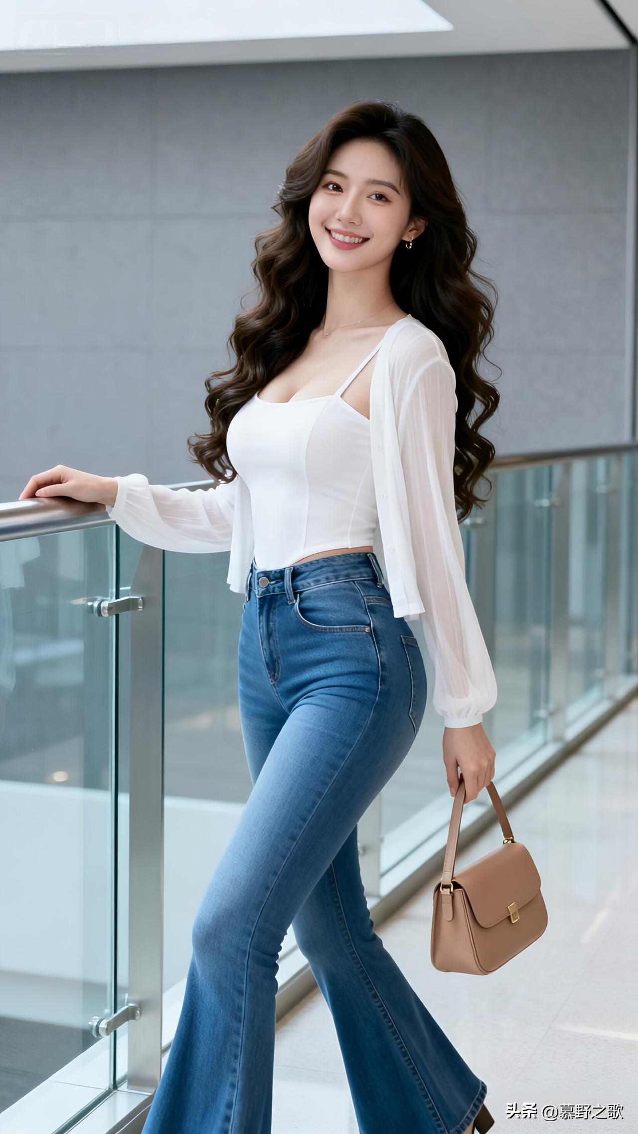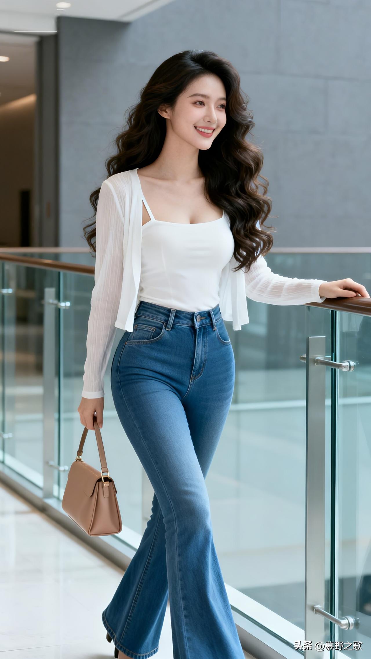 白吊带+雪纺开衫+喇叭裤,是都市的温柔干练 商场走廊里,白吊带配白雪纺开衫与蓝喇叭牛仔裤,棕皮包,把都市的温柔与干练穿在了身上。 开衫的飘逸与吊带的性感平衡,喇叭裤修饰腿型,干净的白与蓝,既适合通勤又不失女性魅力。 通勤穿搭的核心,是“专业与温柔并存”,用舒服的材质与利落的剪裁,在工作中保持优雅。 通勤穿搭 雪纺开衫 喇叭牛仔裤