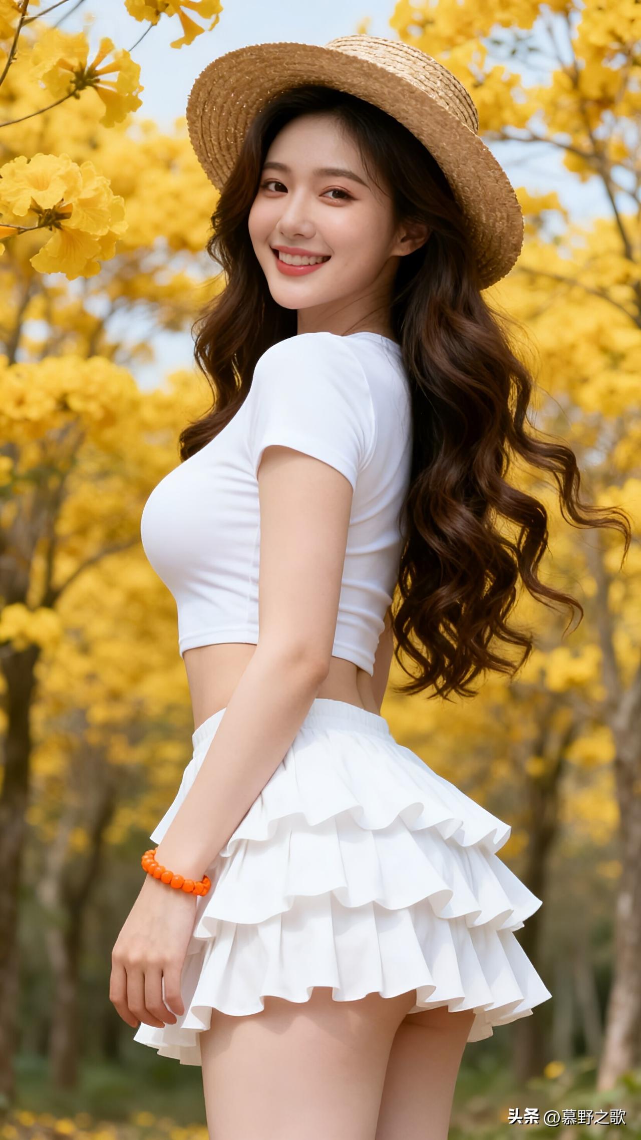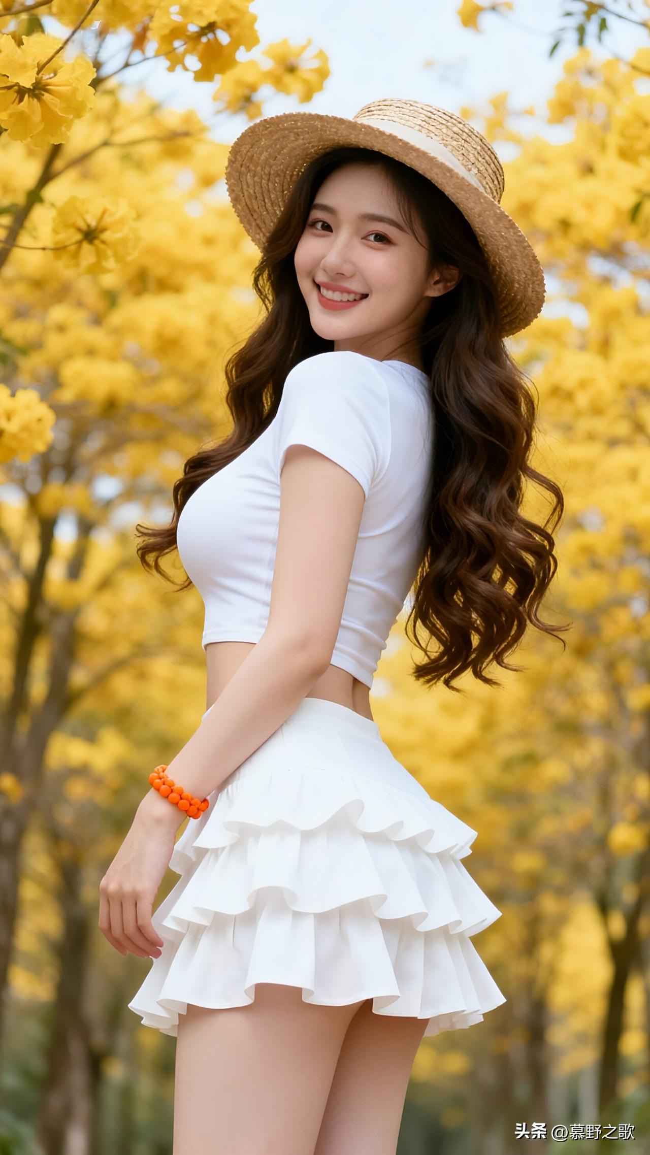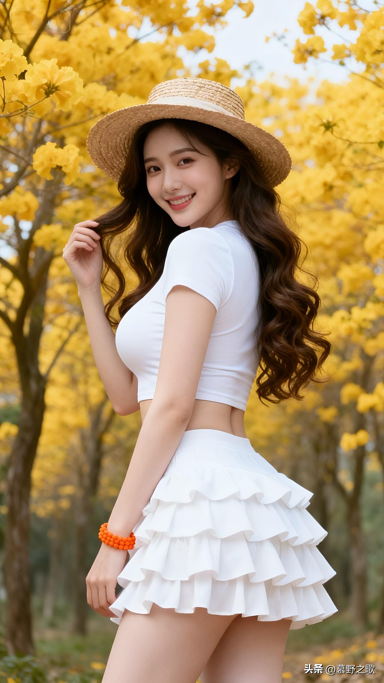 白裙草帽,把春天穿在身上 黄花风铃的明黄与纯白层层蛋糕裙碰撞,草帽与橙珠手链点缀,把春日的元气与温柔拉满。 短款上衣露出腰线,蛋糕裙摆随步伐摇曳,每一处细节都在呼应花海的烂漫。 春日穿搭的精髓,是“与自然对话”——用干净的白与鲜活的黄,让自己成为风景的一部分。 春日穿搭 黄花风铃 蛋糕裙