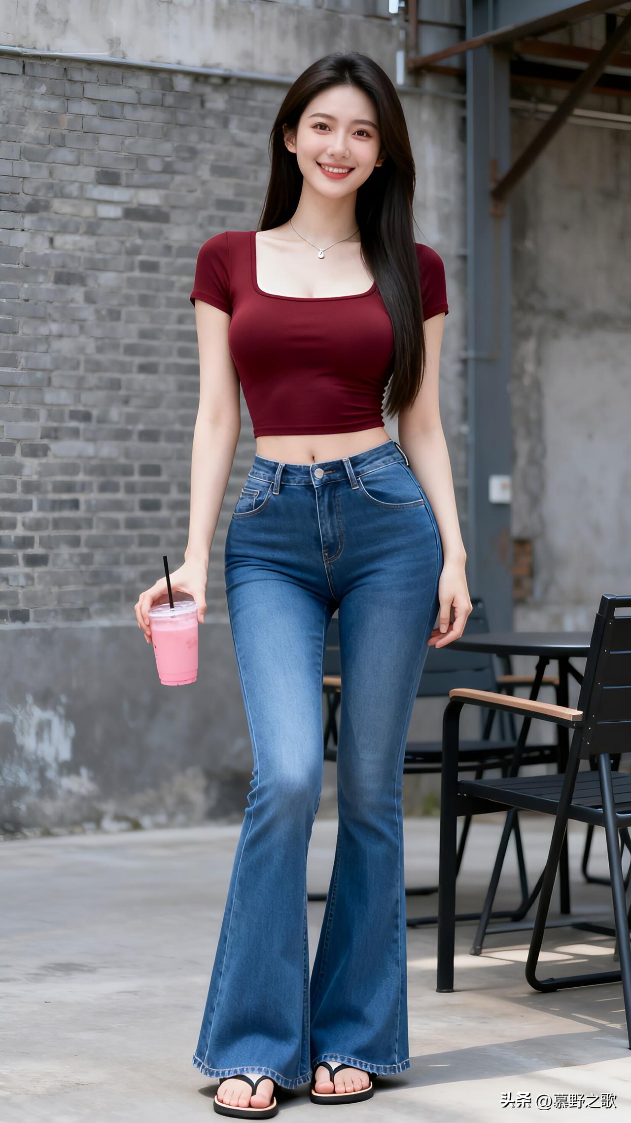 酒红方领+喇叭裤,是街头的慵懒性感 砖墙街角,酒红方领短款T恤配蓝喇叭牛仔裤,夹脚凉鞋与粉饮,把街头的慵懒与性感穿在了身上。 方领设计露出锁骨,喇叭裤修饰腿型,酒红与牛仔蓝的碰撞,复古又时髦。 街头风的核心是“随性不随意”,用基础款碰撞出质感,舒服又好看。 街头穿搭 方领T恤 喇叭牛仔裤