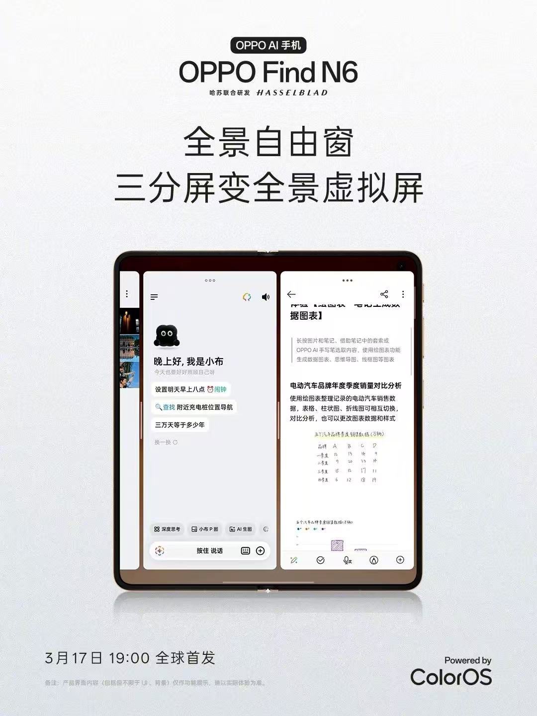 想法一触即发,落笔顺手搞定!OPPO Find N6这次搭载上了OPPO AI 手写笔,提笔就用,一按速记,灵感不拖延,从记录到创作一气呵成。全景自由窗至多支持 4 个应用同屏并行,无极调节,想怎么分就怎么分。大屏交互智能又高效,“折叠最强分屏王” 比电脑更灵活,堪称行走的办公室。更惊喜的是,跨生态协同无缝衔接;Find N6 深度适配苹果全家桶,AirPods、Apple Watch 原生级互联,iPhone 通信共享、Mac 远控投屏… 多端流转无痛体验,果粉换机也不用担心不适应了!