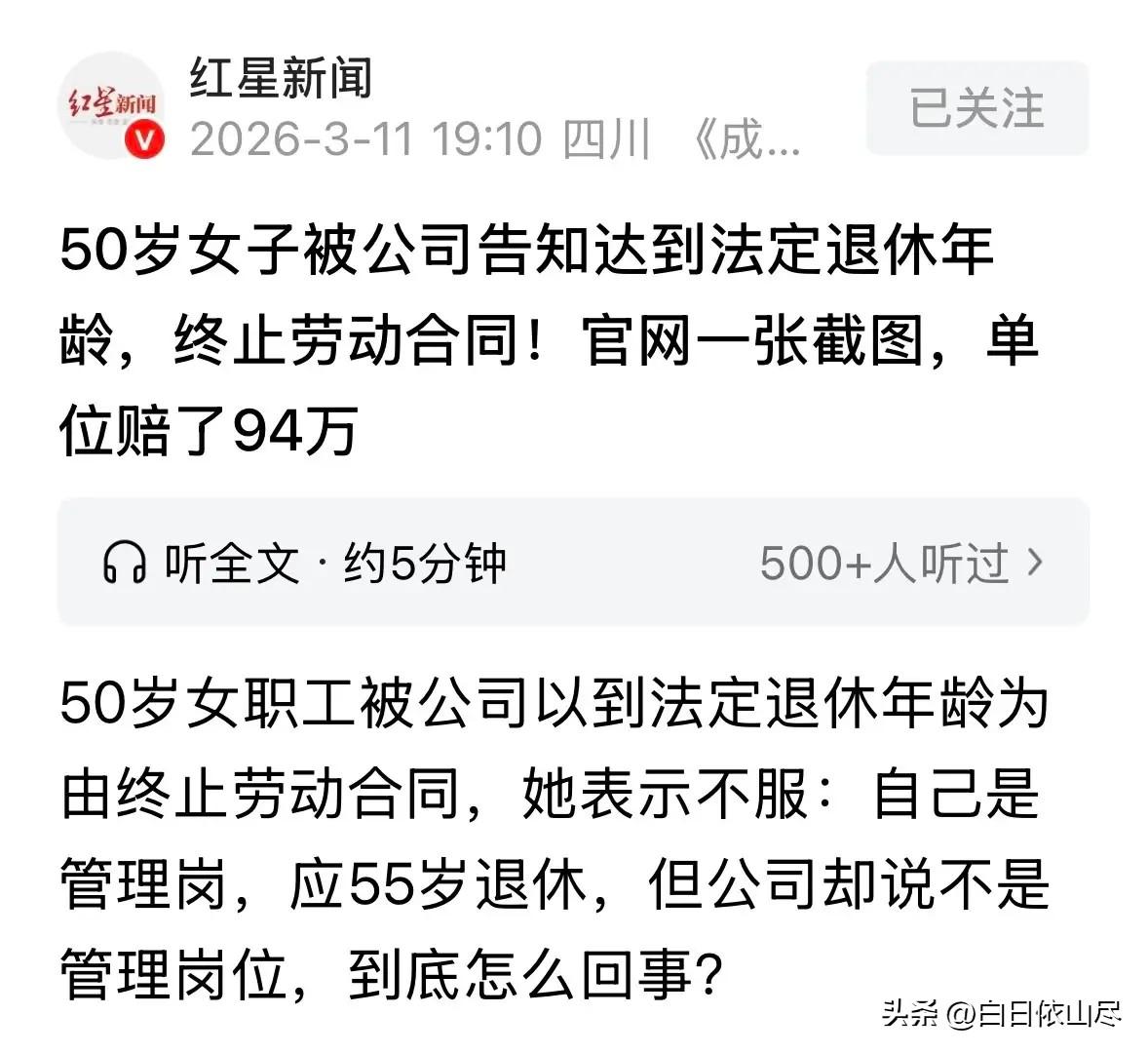 北京,女子刚满50岁,就被公司以到法定退休年龄为由辞退了,女子傻眼,说自己是管理岗,按理说应该55岁再退休,公司这是违法解除劳动合同!她要求公司给她94万的赔偿金,和未休年假工资32万,可公司却咬定女子并不是管理人员,不肯赔钱,女子怒了,直接走仲裁并获得支持,公司这下坐不住了,将女子告上法院,结局精彩了。 北京50岁女员工被强行辞退!自证管理岗应55岁退休,索赔94万+32万,仲裁胜诉公司不服,法院判决太解气 在北京一家企业深耕多年的女员工,刚迎来50岁生日,就收到了公司直接下达的辞退通知,给出的理由简单粗暴——已到法定退休年龄,劳动关系自动终止。 这纸突如其来的辞退决定,让她当场陷入错愕,多年的岗位认知与公司的操作完全相悖,一场围绕岗位身份、赔偿金额的劳动纠纷,就此拉开序幕。 这名女员工在公司长期从事管理相关工作,负责团队日常统筹、工作分配、人员协调等事务,岗位职责明确属于管理岗范畴。 按照北京当地社保与劳动法规,女性管理及专业技术岗位人员,法定退休年龄为55周岁,普通非管理岗女职工才是50周岁退休。 公司无视她的实际岗位属性,强行以50岁为由终止劳动关系,她明确认定这属于违法解除劳动合同,多年的职场付出被随意否定,内心的委屈与不甘,促使她坚决拿起法律武器维权。 她没有选择妥协退让,而是整理好劳动合同、岗位说明书、日常工作履职记录、薪资流水、社保缴纳记录等全套证据,向公司提出两项明确的赔偿诉求。 一是要求公司支付违法解除劳动合同赔偿金94万元,这笔金额是按照她的工作年限、离职前12个月平均工资,结合违法解除双倍赔偿标准核算得出; 二是主张在职期间多年累计未休年假工资32万元,核算依据为法定300%年假工资标准,扣除已发放的正常工资后,额外主张200%的补偿差额。 两项诉求金额合计超过百万,公司接到赔偿要求后,态度十分强硬,直接全盘拒绝。 公司方始终坚持主张,女员工实际为普通操作岗位,并非管理岗,50岁辞退完全符合法律规定,属于合法终止劳动关系,拒绝支付任何形式的赔偿金与年假工资。双方多次沟通无果,矛盾彻底激化,没有任何协商余地。 面对公司的拒不配合,女员工果断向劳动人事争议仲裁委员会提交仲裁申请,将自己的诉求与完整证据链一并提交。仲裁庭审过程中,她详细陈述了自身岗位性质、工作内容,逐一出示证明管理岗身份的材料,清晰说明退休年龄适用标准与赔偿核算依据。 公司方虽极力辩解,却无法提供有效证据证明女员工为非管理岗,也无法证明已合理安排年假或支付过年假补偿。 仲裁委经过全面审理、证据核查与法规比对,最终采信女员工的全部主张,认定公司无视岗位属性、强行辞退的行为构成违法解除劳动合同,支持她94万赔偿金与32万未休年假工资的核心诉求。 仲裁胜诉的结果,让原本态度强硬的公司彻底坐不住了,公司始终不认可岗位认定结果,也不愿承担百万赔偿,随即向人民法院提起诉讼,要求推翻仲裁裁决,拒绝支付任何赔偿。 案件进入司法程序后,法院重点围绕三大焦点展开审理:女员工实际岗位是否为管理岗、公司解除劳动关系是否合法、赔偿金额核算是否合规。 法院逐一核查劳动合同约定、工作台账、履职记录、公司内部岗位公示等关键证据,严格对照北京关于女职工退休年龄的执行标准,确认女员工长期从事管理工作,退休年龄应按55周岁执行,公司50岁辞退确属违法。 最终法院作出终审判决,驳回公司的全部诉讼请求,维持仲裁裁决结果,要求公司限期向女员工支付94万违法解除赔偿金与32万未休年假工资,用法律公正为这场持续数月的纠纷画上句号。 事件在网络曝光后,迅速引发网友热议。不少打工人表示共鸣,认为职场中岗位认定、退休年龄争议频发,企业不能随意曲解法规侵犯员工权益。 有HR从业者留言,女职工退休年龄按岗位区分是明确规定,企业不能一刀切按50岁辞退,需承担违法成本。 还有法律领域网友科普,违法解除双倍赔偿、未休年假300%工资都是法定权利,员工勇敢维权值得肯定。 更多网友点赞女员工的坚持,认为面对不公不妥协,用证据和法律维护自身权益,最终迎来了公正结果。 对此,你们有什么看法,欢迎评论留言~