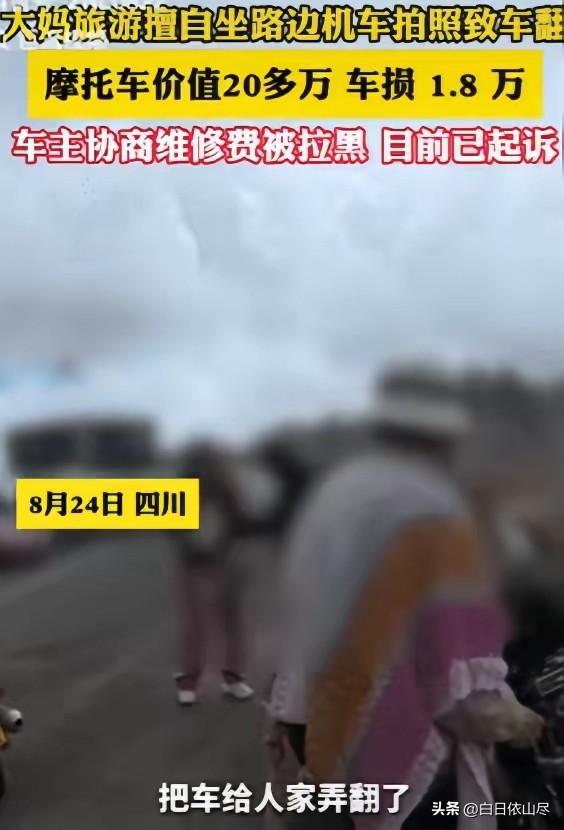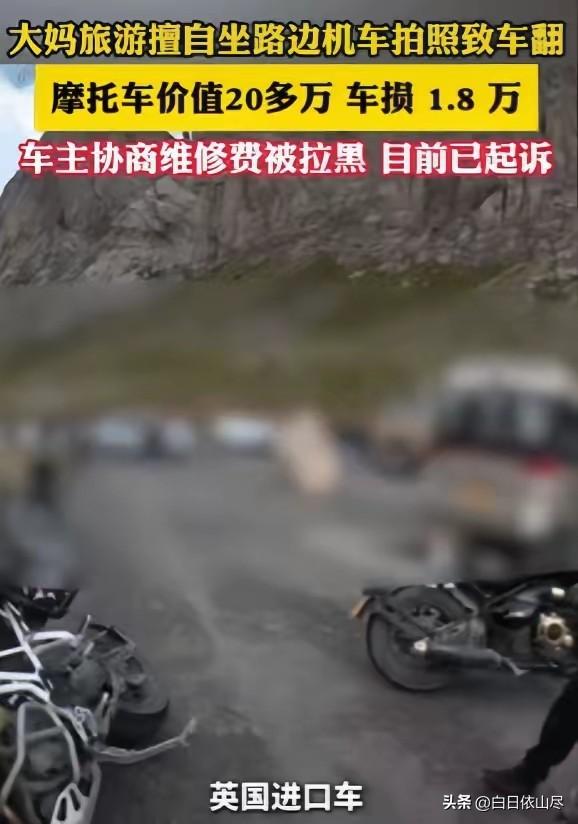 “这下后悔了吧!”四川一大妈不听游客劝阻,执意要坐价值20多万元的摩托车拍照,不料,导致摩托车倾倒在围栏上,车上头盔滚落山崖,车主送到4S店定损费为1.8万元,而大妈得知价格后的做法,让人很是气愤,网友:绝不能惯着大妈的臭毛病! 四川一处热门景区的观景平台上,因为一辆停在路边的摩托车,闹出了一场让人十分无语的纠纷。 一辆价值超过20万元的重型摩托车停放在护栏边,车身造型亮眼,引得不少路过的游客忍不住多看几眼,也有人拿出手机远远拍照留念,可谁也没想到,一位大妈的任性举动,直接让这辆豪车遭了殃。 当时摩托车车主只是短暂离开,去附近拍摄风景,并没有将车辆骑走,只是用侧撑将车稳稳停在平整的地面上。 现场有不少游客都知道这辆车价格不菲,都只是远远观看,没有上前触碰,还有人主动提醒身边同行的人,不要靠近车辆,避免不小心造成损坏。 一位大妈在看到这辆造型炫酷的摩托车后,立刻产生了拍照打卡的念头,完全不顾周围游客的轻声劝阻,径直走到车辆旁边。 她没有等待车主回来征得同意,也没有小心留意车辆状态,自顾自地拿起放在车上的头盔戴在头上,随后抬腿就跨坐在了摩托车的座椅上,想要摆出姿势拍照。 由于大妈动作幅度较大,加上重心不稳,原本依靠侧撑支撑的摩托车瞬间失去平衡,车身猛地向外侧倾斜,随后重重地倾倒在旁边的护栏上,发出沉闷的撞击声。 放在车上的头盔也因为剧烈晃动直接滑落,顺着旁边的山崖滚了下去,很长一段时间后才被工作人员帮忙找回。 车辆倒地后,车身多处出现了明显的损伤,右侧护板出现大面积开裂,油箱位置被撞出凹陷,车把、脚踏、刹车线等关键部位均有不同程度的损坏,原本崭新的车辆瞬间变得伤痕累累。 周围的游客看到这一幕都十分吃惊,纷纷上前拦住想要离开的大妈,并用手机记录下了现场的全部过程。 车主返回看到车辆被损坏后,第一时间保持冷静,联系了车辆官方售后进行定损。 为了确保维修价格准确,车主将车辆送到专业4S店进行全面检测,经过工作人员细致检查,列出了详细的维修清单,整体维修费用合计达到1.8万元。 面对清晰的现场视频和正规的定损报告,大妈无法否认自己的行为,当场承认是自己强行坐车导致车辆倾倒损坏。 在现场沟通后,大妈先向车主支付了1000元作为赔偿,并且主动留下了自己的联系方式,添加了车主的微信,承诺回去之后会尽快将剩余的1.7万元赔偿款补齐。 车主相信了大妈的说法,没有再过多追究,花费大量时间和精力,将受损的摩托车从景区一路送回维修门店。 可当车主把正式的定损单和维修报价发送给大妈后,对方却开始不断拖延,先是找各种理由推脱,后来干脆不再回复任何消息。 车主多次拨打语音电话和手机号,均被对方直接挂断,没过多久,车主发现自己已经被大妈拉黑,微信、电话全部联系不上,对方用直接失联的方式,逃避本该承担的赔偿责任。 车主原本只是想要拿回合理的维修费用,却没想到遇到这样不负责任的行为,原本简单的民事纠纷,也只能通过收集证据走法律途径解决。 这段现场视频被传到网上后,立刻引发了大量网友的关注和讨论。大家对大妈无视提醒、擅自触碰他人贵重物品的行为表示不解,更对事后拉黑逃避责任的做法感到气愤。 不少网友表示,出门游玩要遵守基本规则,未经允许不能随意动用他人物品,造成损坏更应该主动承担责任,而不是耍无赖逃避。 对此,你们有什么看法,欢迎评论留言~