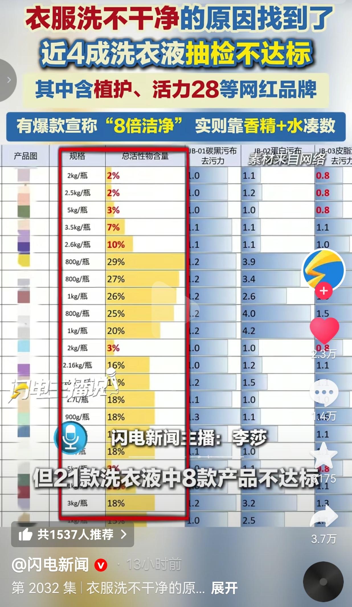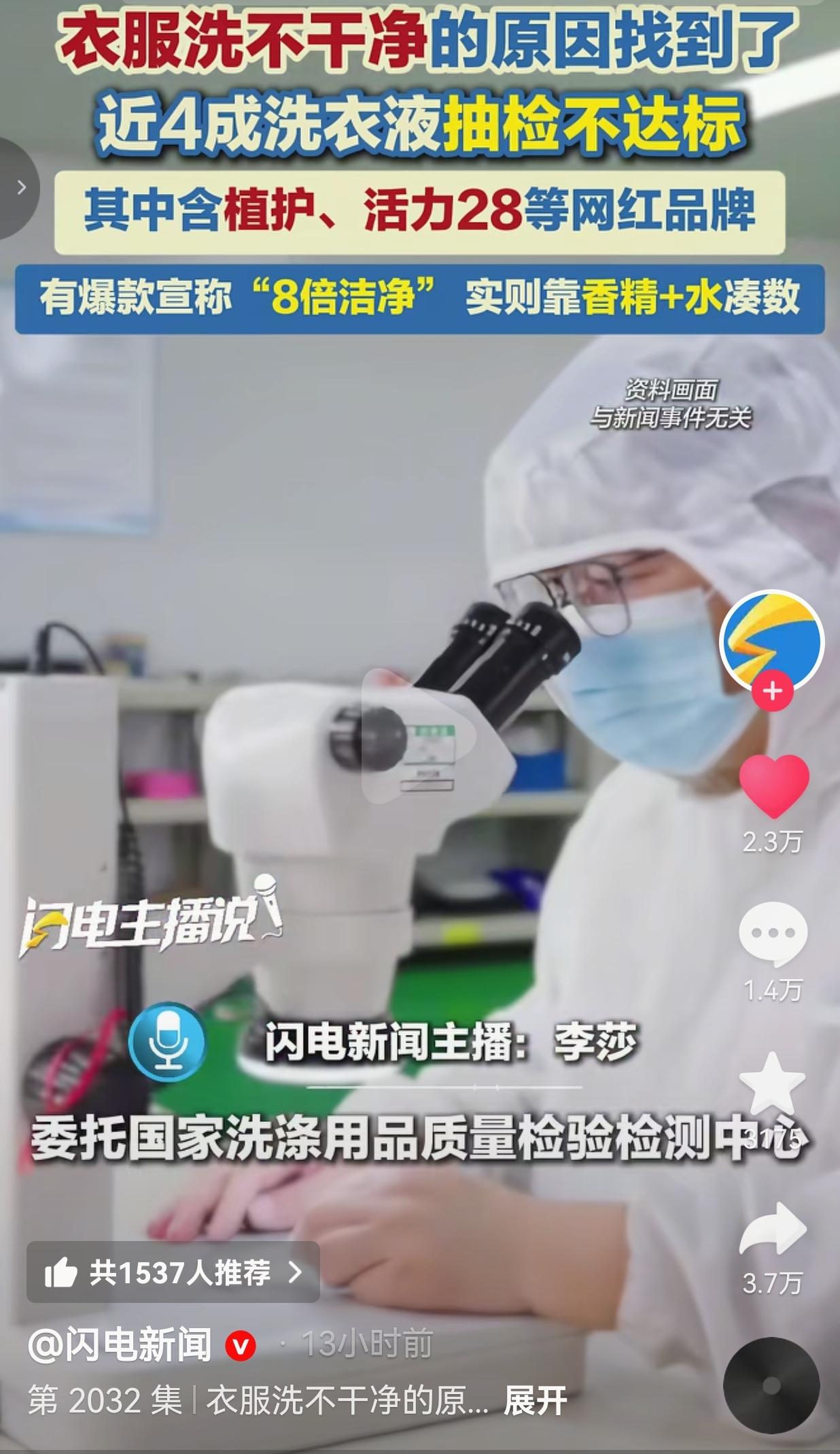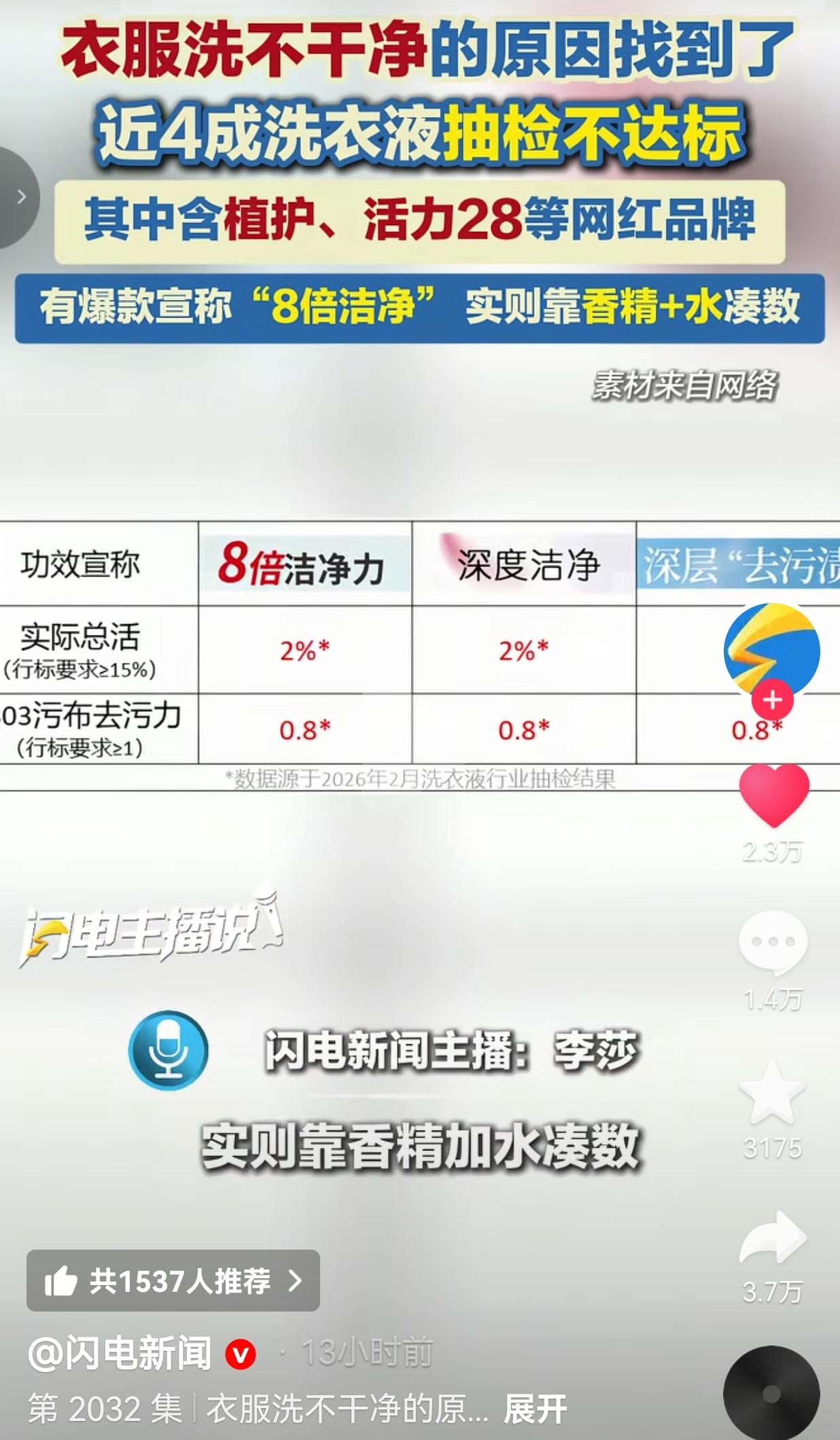 你是不是遇到衣服总洗不干净?别骂洗衣机了!你的网红洗衣液可能只是“香精兑水”! 刷到这条新闻的时候,瞬间就停住了——合着我这几年洗衣服,一直在给衣服“加香味”,根本没在“去污渍”? 《中国消费者报》联合专业机构测了21款网红洗衣液,结果吓死人:近4成不达标,植护、活力28这些大家眼熟的牌子都在榜上! 更离谱的是,有款爆款吹得天花乱坠,说什么“8倍洁净力”,结果测出来总活性物含量才2%——而行业推荐标准是≥15%! 2%是什么概念?相当于你花大价钱买了一大瓶“水+香精”,真正能去污的成分连个零头都不到! 难怪我总觉得衣服越洗越“假干净”:闻着香喷喷,领口、袖口的黄渍还是老样子,孩子校服上的果汁印搓半天都搓不掉,原来不是我手笨,是洗衣液根本没干活! 网友看到后评论说:“我说怎么回事!每次洗完香得要命,就是领口洗不白,原来全是香精兑水!” 也有的网友说:“我家孩子校服,用网红洗衣液搓三遍都没用,换了老牌子肥皂一下就干净了!” 还有的网友说:“难怪我老公总说我不会洗衣服,今天才知道,是洗衣液骗了我们!” 更让人生气的是,这些商家太会钻空子了:明明没有强制性国家标准,就敢把“8倍洁净”“深度去污”打在瓶身上,把一堆稀释到不能再稀的液体,包装成“高级香氛洗衣液”,哄着我们为那点香味买单。 等你发现衣服洗不干净,去找他们,人家一句“我口头告知过风险了”,就想把责任推得一干二净。 可律师早就说了,卖违法产品,就算你说破了天,告知也没用! 网友气得直骂: “香精不要钱是吗?香得刺鼻,污渍纹丝不动,这叫洗衣液?这叫香水兑水!” “直播间9.9元一大桶,我还以为捡便宜,现在才知道,便宜全是套路!” “商家良心不会痛吗?天天吹得神乎其神,结果全是糊弄老百姓!” 我想起我妈之前总跟我说“便宜没好货”,我还嘴硬说“网红款性价比高”,现在脸都打肿了。她每次洗衣服都要倒半瓶,说“多倒点才干净”,可看着那些发黄的床单,我才明白:不是量不够,是这瓶里根本没装“干净”,只装了商家的套路。 有宝妈一句话说出所有人心声: “给孩子洗衣服,我不求多香,只求能洗干净、不伤皮肤,就这么难吗?” 我们总在为“概念”买单:为了“8倍洁净”多花十块钱,为了“高级香氛”囤好几箱,却忘了洗衣液最本质的作用是“把衣服洗干净”。那些被我们忽略的数字,才是最实在的答案——总活性物含量低于15%的,再便宜也别碰;吹得越神的,越要看看它的成分表是不是在“凑数”。 看着检测报告里那一行行刺眼的“2%”,我突然懂了:消费主义的陷阱从来都藏在这些日常小事里。我们以为自己在精打细算,其实是在为商家的营销话术买单;我们以为给家人用了“好东西”,其实是让他们穿着满是污渍的衣服,闻着廉价香精过日子。 对此,你怎么看?