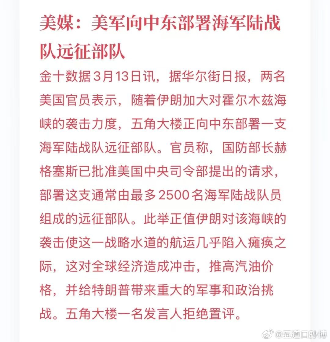 伊朗发起第45波打击3月13日据华尔街日报,两名美国官员表示,随着伊朗加大对霍尔木兹海峡的袭击力度,五角大楼正向中东部署一支海军陆战队远征部队。部署这支通常由最多2500名海军陆战队员组成。。。