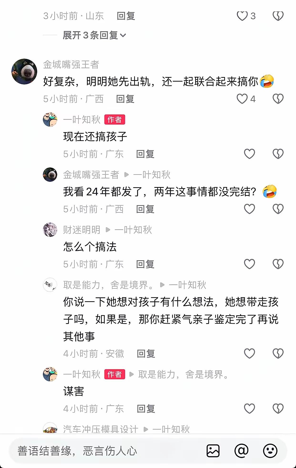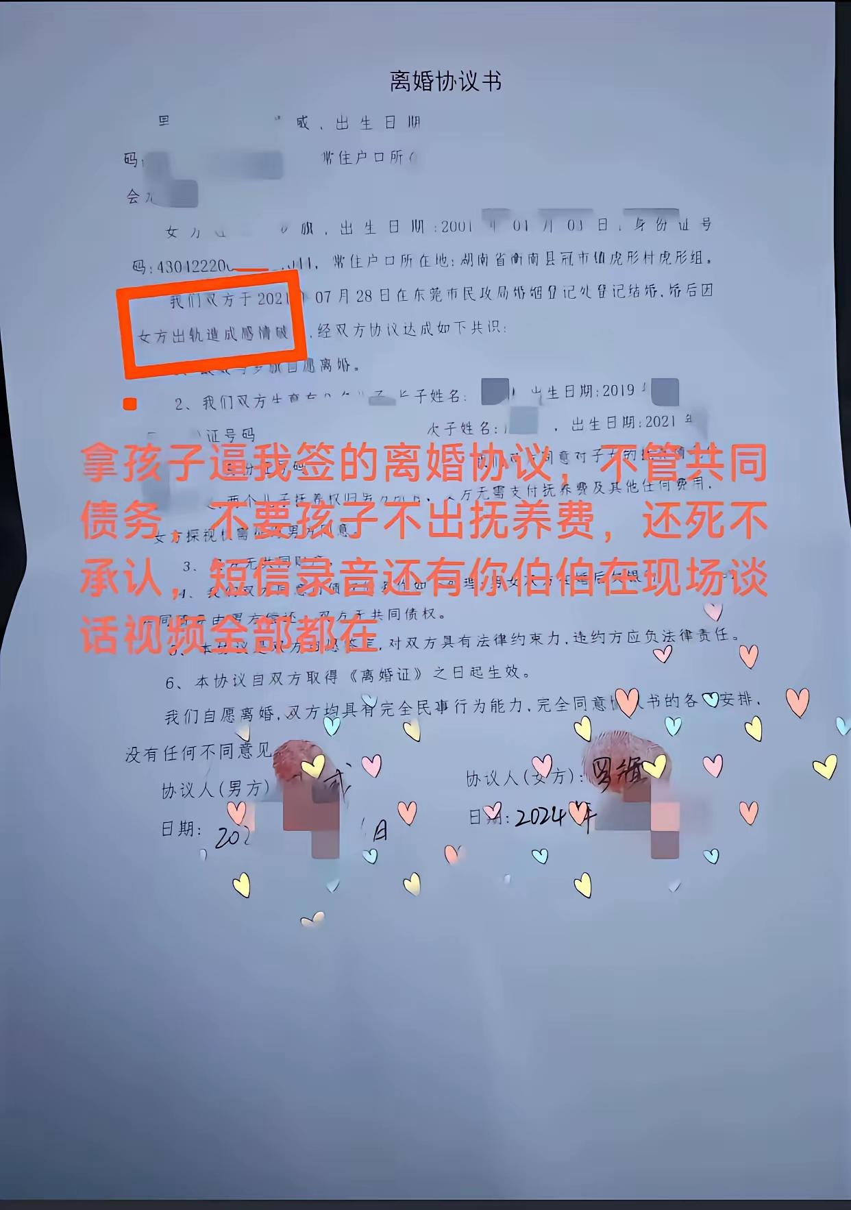 广东东莞男子血泪控诉:前妻出轨弃子反告我入狱,今又联手情夫谋害亲儿,人性之恶何以至此?全网怒问天理何在! 婚姻的围城里,有人守护誓言,有人却将背叛当作筹码。广东东莞的戴先生,怎么也没想到,七年感情换来的,竟是一场精心设计的“局”。妻子婚内多次出轨,他为了孩子选择隐忍,却等来一纸冰冷的离婚协议——女方不分债务,不要孩子,不给分文抚养费。更残酷的还在后头,前妻竟联合情夫,以“婚内强奸”为由将他送入牢房,羁押三十天。当他以为噩梦结束,只想带着两个幼子平静生活时,前妻的魔爪再次伸向孩子。这不是电视剧,这是正在发生的、令人脊背发凉的真实人生。 当我们翻开那份离婚协议,白纸黑字写满了女方的决绝。放弃孩子抚养权,拒绝承担共同债务,连最基本的抚养费都拒不支付。这已不是简单的感情破裂,而是对母亲身份的彻底抛弃,是对血缘亲情的冰冷切割。协议背后,是一个父亲被迫签下的屈辱,更是两个孩子未来风雨飘摇的注脚。法律文书此刻显得如此苍白,它裁定了婚姻的终结,却裁不断恶意的延续。 比抛弃更狠的,是反手一刀的构陷。“婚内强奸”的指控,如同一场精准的报复。当丈夫还沉浸在抓奸的愤怒与伤痛中,昔日的枕边人已准备好将他推入法网。一纸《取保候审决定书》,成了他人生抹不去的污点。这一个月“包吃包住”的经历,摧毁的不仅是一个男人的尊严,更是他对人性最后的信任。出轨者逍遥法外,受害者锒铛入狱,这般颠倒黑白的操作,究竟是谁在给罪恶撑腰? 然而,人性的深渊没有下限。就在戴先生试图带着孩子重新站起时,前妻的骚扰再度袭来。她开始“搞孩子”,试图干扰孩子本就脆弱的正常生活。虎毒尚不食子,究竟是什么,让一个母亲能对亲生骨肉屡下狠手?是为了争夺控制权,还是单纯不想让前夫好过?这种将孩子当作报复工具的行为,已然践踏了为人母最后的底线,其心可诛。 更令人心寒的是女方家庭的“助纣为虐”。从聊天记录可见,丈母娘对女儿的出轨行为轻描淡写,甚至倒打一耙,指责女婿“连老婆都管不住”。是非观的彻底扭曲,家庭教育的严重缺失,在此展现得淋漓尽致。难怪网友痛斥“岳母这般嘴脸,女儿能好到哪里去”。原生家庭的纵容与歪理,往往是悲剧持续发酵的温床。 全网都在为戴先生揪心。有人劝他放手,带孩子远走他乡;有人提醒他去做亲子鉴定,厘清真相;更多人则是愤怒与不解:为何正义如此难伸?当婚姻成为猎场,当亲情化为利刃,一个普通父亲该如何保护他的孩子?这已不只是一桩家庭纠纷,它叩问着法律对弱势父亲的保护力度,也考验着社会对基本伦理道德的捍卫决心。 戴先生的遭遇,像一面残酷的镜子,照见了极端自私人格的可怕。从出轨到弃养,从构陷到骚扰,每一步都在挑战公序良俗的极限。它告诉我们,一段坏掉的婚姻,最可怕的不是结束,而是结束后那无穷无尽的、充满恶意的余震。而孩子,永远是最无辜的牺牲品。 目前,戴先生仍在为保护孩子而奔走。他的故事警示所有人:结婚需谨慎,不仅要看清伴侣,更要看清其背后的家庭。当善良遇到没有底线的人,学会用法律武器全力反击,才是对自己和孩子最大的负责。我们期待相关部门能深入调查,不让构陷得逞,更期待两个孩子能远离风暴,拥有一个平安的童年。天道好还,望正义不至迟到。 (来源:根据当事人“一叶知秋”在社交平台发布的图文、视频及聊天记录整理) 婚内出轨 人性之恶