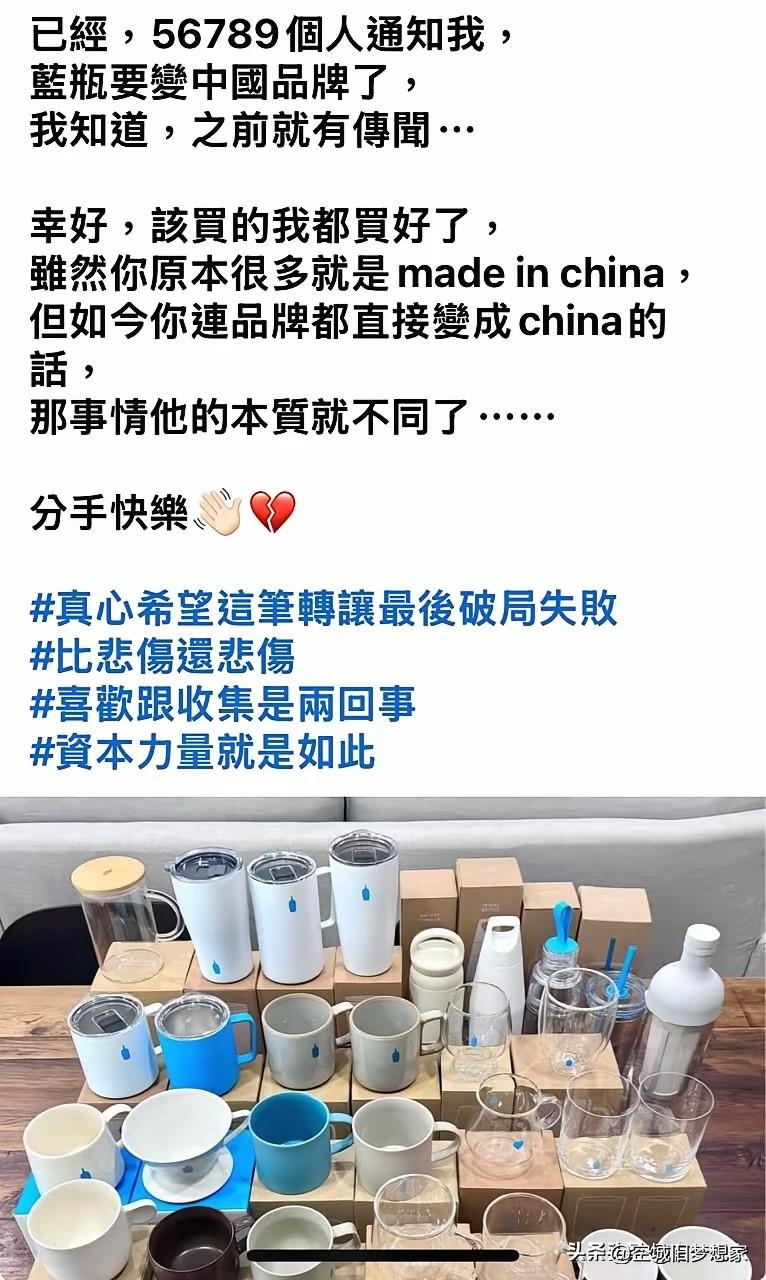 台湾绿蛙“蓝瓶粉”破防现场 雀巢蓝瓶咖啡被瑞幸收购, 这位绿娃晒出一桌子蓝瓶周边, 痛心疾首喊“分手快乐”, 还说“中国制造可以,中国品牌不行”。 明明很多产品早就标着“Made in China”, 用得心安理得; 现在只是品牌归了中国企业, 就跳脚骂“本质不同”, 这副嫌贫爱富、数典忘祖的样子, 把台独的双标刻进了骨子里。 一边薅着中国制造的羊毛, 一边对着中国品牌吐口水, 既想享受大陆发展的红利, 现在连品牌归属变了, 就跳脚说“本质不同”, 这双标玩得也是没谁了。 说到底, 怕的不是品牌易主, 是怕中国品牌越来越强, 自己那点可怜的优越感再也站不住脚吧? 蓝瓶咖啡被瑞幸收购 台湾奇葩言论 数典忘祖