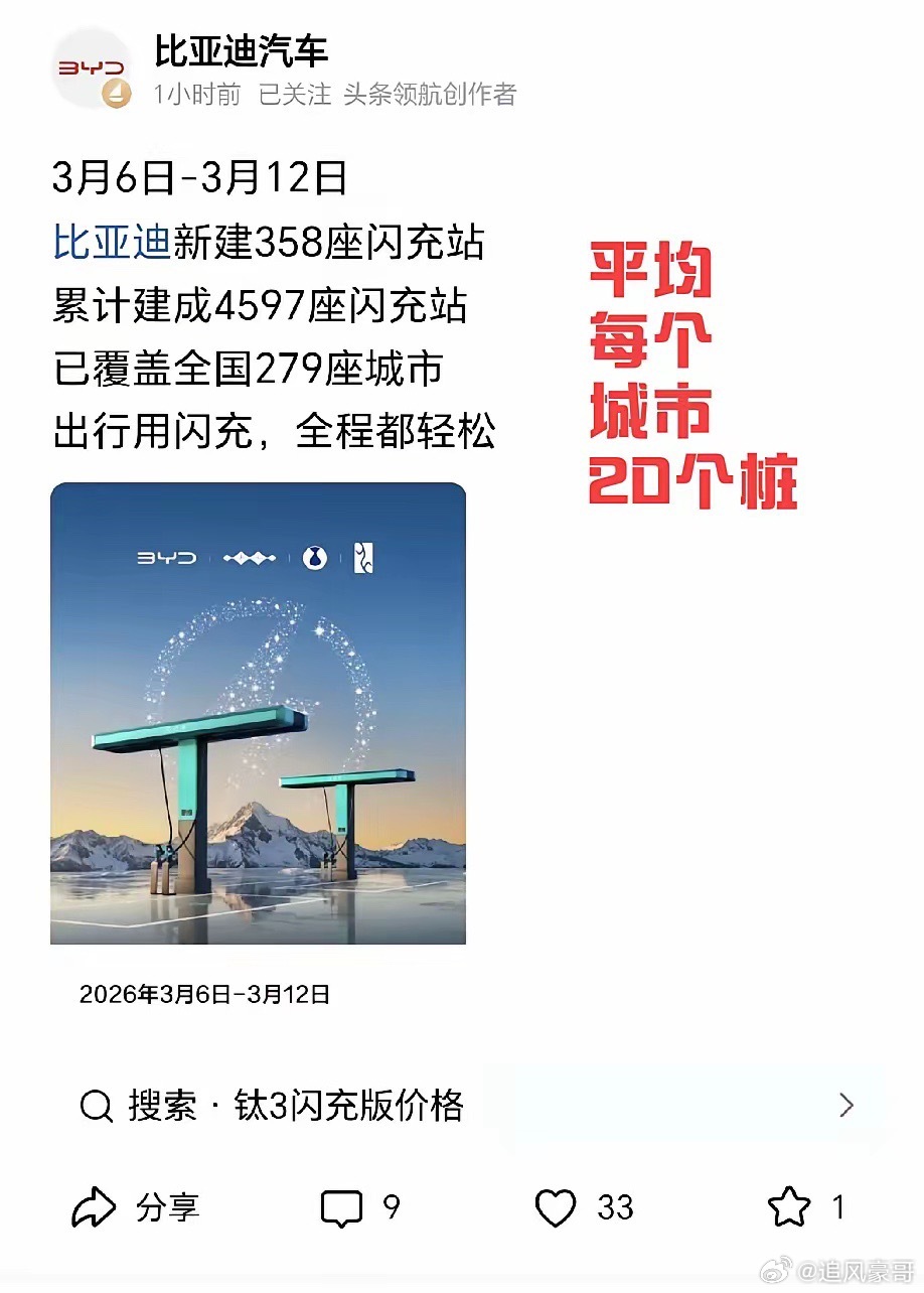 比亚迪和京东强强合作。官方闪充站消息,7天新建358座闪充站,每天50多座,还有300天,按照这个速度一年2万座毫不费力,费力的可能就是人心中的成见了,地方保护主义啥的。