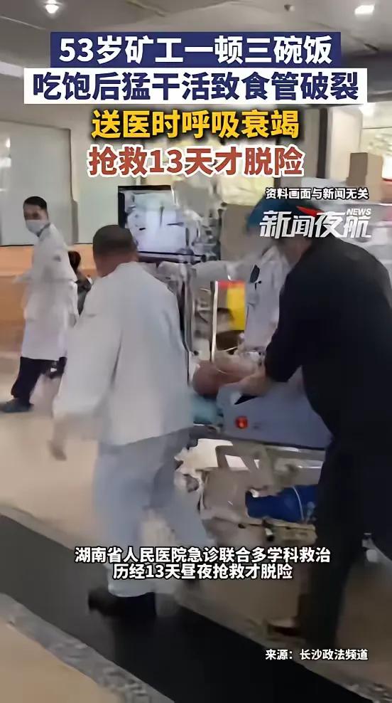 “太吓人了!”近日,湖南,一53岁矿工干完活后饿的发慌,回家后猛吃三碗米饭,加辣椒炒肥肠,刚撂下碗就接着去扛煤土,结果没多久就剧烈腹痛,送医院确诊为食管破裂,诱发呼吸衰竭与脓毒症,抢救了13天才捡回一条命!网友:吃完别猛干! 这位矿工李先生,大半辈子都在井下讨生活,干的都是实打实的体力活,饿起来的时候,眼里就只有能填肚子的热饭热菜。那天收工早,他拖着一身疲惫往家赶,肚子早就饿得咕咕叫,一进门就扒拉了三大碗米饭,就着重油重辣的肥肠,风卷残云般吃了个底朝天。他想着趁劲儿足,赶紧把剩下的煤土扛完,没成想刚弯下腰发力,胸口和肚子就传来一阵撕裂般的剧痛,冷汗瞬间浸透了衣服,连呼吸都变得困难起来。 送到医院时,他已经出现了呼吸衰竭和脓毒症,情况危急到了极点。医生说,食管破裂是非常凶险的急症,胃里的食物和胃酸会顺着破口流进胸腔,引发严重的感染和炎症,稍有不慎就会危及生命。为了救他,医院急诊联合了多个科室,前后折腾了13天,才把他从鬼门关拉了回来。 很多人看完新闻都在感慨,觉得这事儿太离谱,不就是吃饱了干活吗,怎么会闹到这么严重?其实,这种“吃饱就猛干”的习惯,藏着我们看不见的健康陷阱。食管本身就很脆弱,饱食后胃里充满了食物,腹压本来就高,这时候突然发力扛重物、剧烈运动,会让胸腔和腹腔的压力瞬间飙升,直接冲击食管,很容易造成破裂。尤其是像李先生这样的体力劳动者,平时习惯了高强度劳作,往往会忽略身体发出的预警信号,总觉得“扛一扛就过去了”,可偏偏就是这种“扛一扛”,把小问题拖成了大灾难。 我们总在说要健康生活,要劳逸结合,但对于很多像李先生这样的人来说,“劳逸结合”更像是一种奢侈品。他们的生活里没有“慢慢来”的选项,只有“赶紧干”的催促。 各位读者你们怎么看?欢迎在评论区讨论。