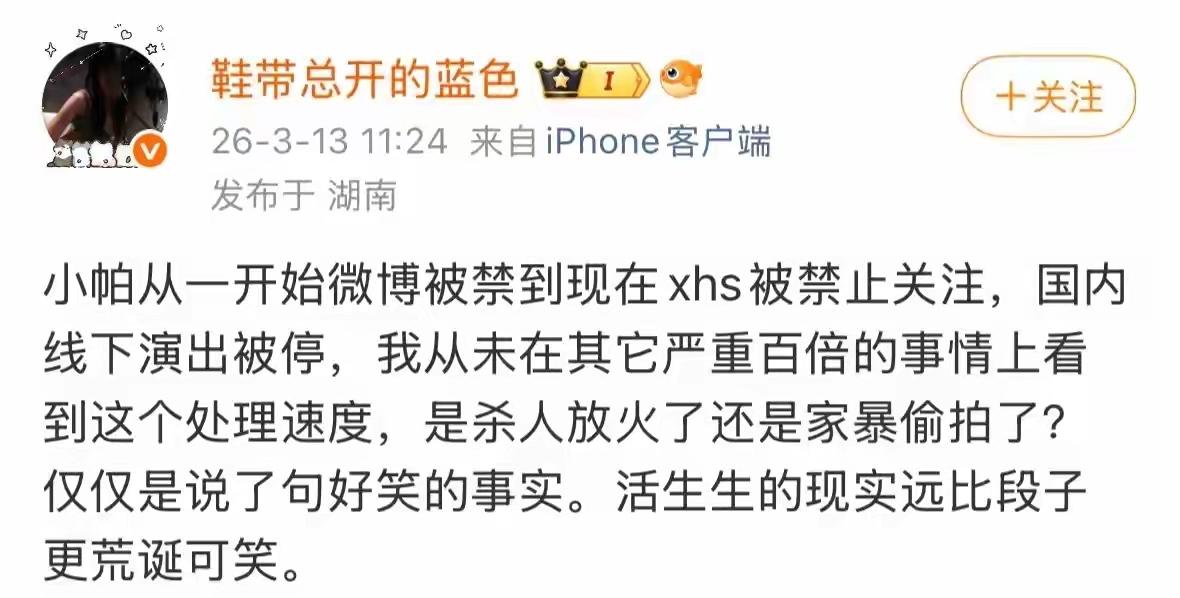 一个未婚女青年,靠假设场景、挑衅性内容博取流量,还有理喊冤了?脱口秀可以存在讽刺的艺术手法,但不能乱开地图炮。 什么叫“发烧了,还要扶墙给老公孩子做饭?” 如果换一种说法,她能接受吗? “发烧了,还要加班挣钱给老婆买包。” 这女的就是故意的。除开特殊个例、极端情况外,有几对夫妻会这样相处? 靠贩卖焦虑,挑动对立,该封。