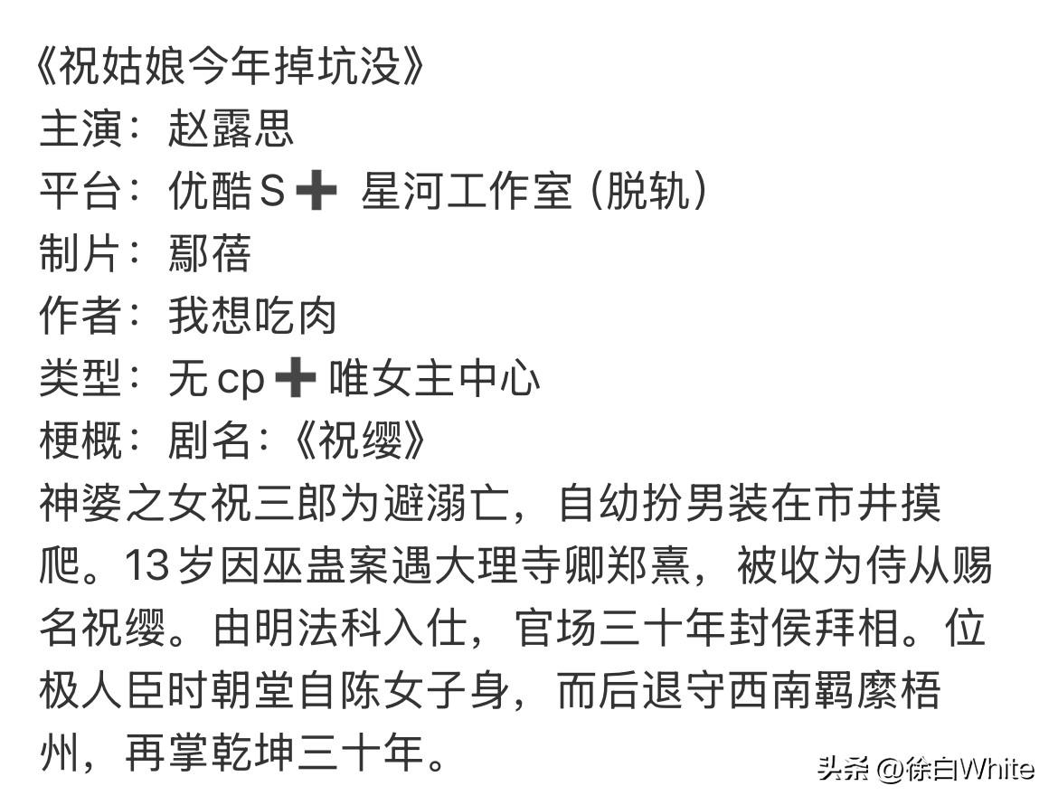 3月14日,赵露思新剧定了,5月1日进组! 新剧是优酷超级S+,《祝姑娘今天掉坑了没》大女主+无cp,女主女扮男装进入官场,靠自己走到朝堂中心,一路升职到丞相! 赵露思直播说的,让大家期待的5月好消息就是这个,这部剧是定女选男,赵露思定了,男主接触邓为,大概率是他! 关于赵露思下部剧之前一直备受热议,如今赵露思讨论度下降反而没什么人提起了,作为赵露思记不住台词后的首部剧,一定备受关注,期待赵露思重回剧组吧!